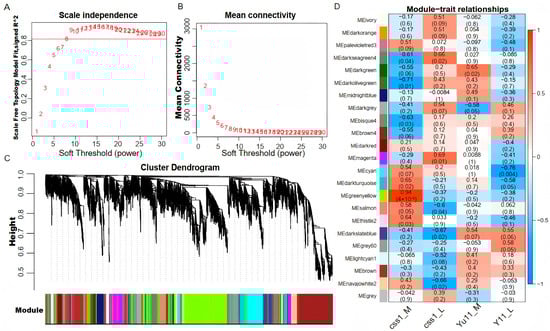 Weighted gene co-expression network analysis (WGCNA). (A,B) Determination of the soft-thresholding power: scale-free topology fit index (A) and mean connectivity (B) for various powers. (C) Gene clustering dendrogram based on topological overlap. Each leaf represents a single gene. A total of 22 distinct co-expression modules were identified and labeled with different colors. (D) Heatmap showing the correlation between modules and sample traits. In each cell, the top number indicates the Pearson correlation coefficient, and the bottom number represents the corresponding p-value.