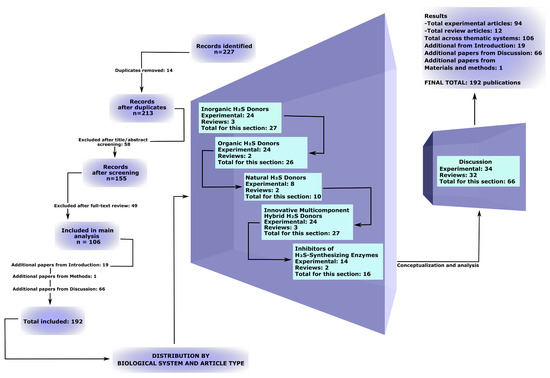 This systematic review was conducted in strict accordance with the PRISMA-ScR guidelines [23], ensuring a structured and transparent analytical approach. A comprehensive literature search was performed using major international databases, including PubMed, Scopus, Web of Science, and Google Scholar. The scoping review includes 192 scientific sources, ≈70% of which were published between 2022 and 2025. Notably, approximately ≈70% of the studies cited in the “Results” section were published during this same period, highlighting both the high relevance and rapid expansion of research on the role of H2S in neuroprotection following traumatic injuries to the central and peripheral nervous systems. This further underscores the need for systematic conceptualization of these data, which was first accomplished in the present work.