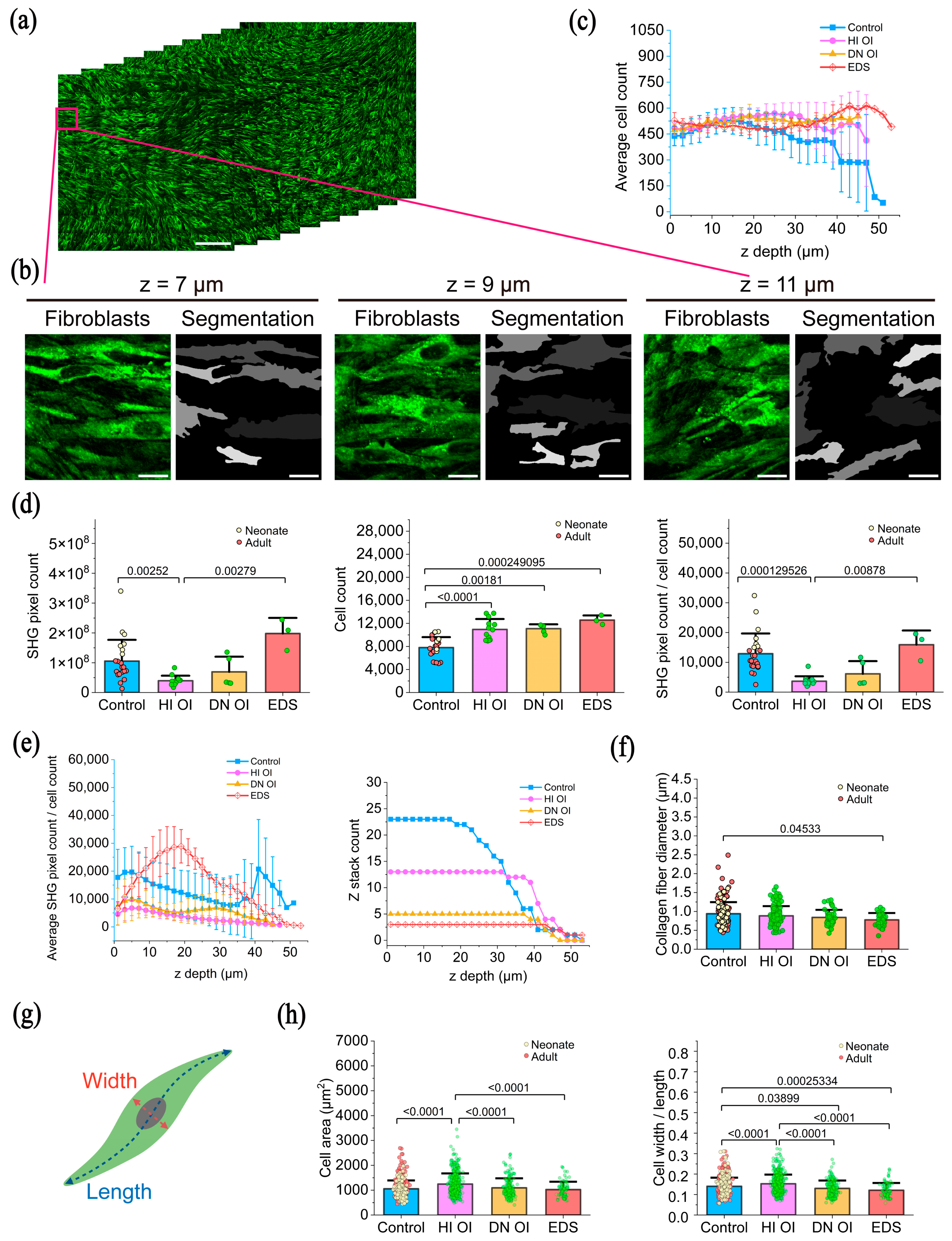 Ma, Y.; Bo, Q.; Zhang, Z.; van Haasterecht, L.; Kloen, P.; Rustemeyer, T.; Ventura, L.; Zhytnik, L.; Eekhoff, E.M.W.; Micha, D.; et al. Assessment of Collagen and Fibroblast Properties via Label-Free Higher Harmonic Generation Microscopy in Three-Dimensional Models of Osteogenesis Imperfecta and Ehlers-Danlos Syndrome. Int. J. Mol. Sci. 2025, 26, 11848. https://doi.org/10.3390/ijms262411848