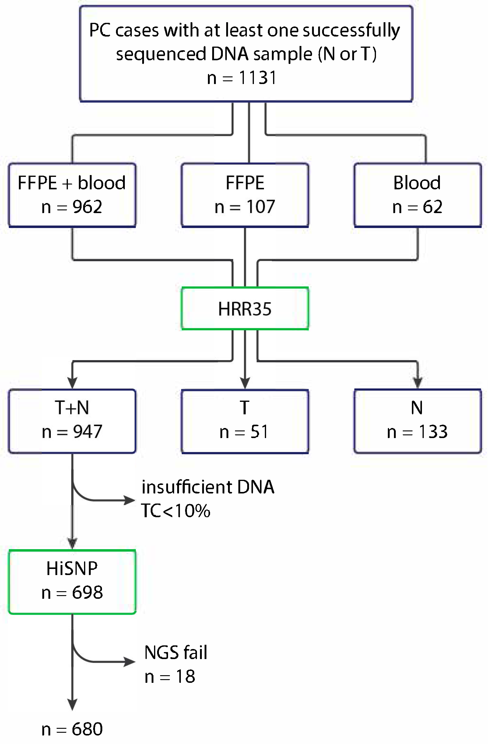 | Characteristic | PC Cases Tested for HRR Mutations (n = 1131) | PC Cases Tested for HRD Score (n = 680) |