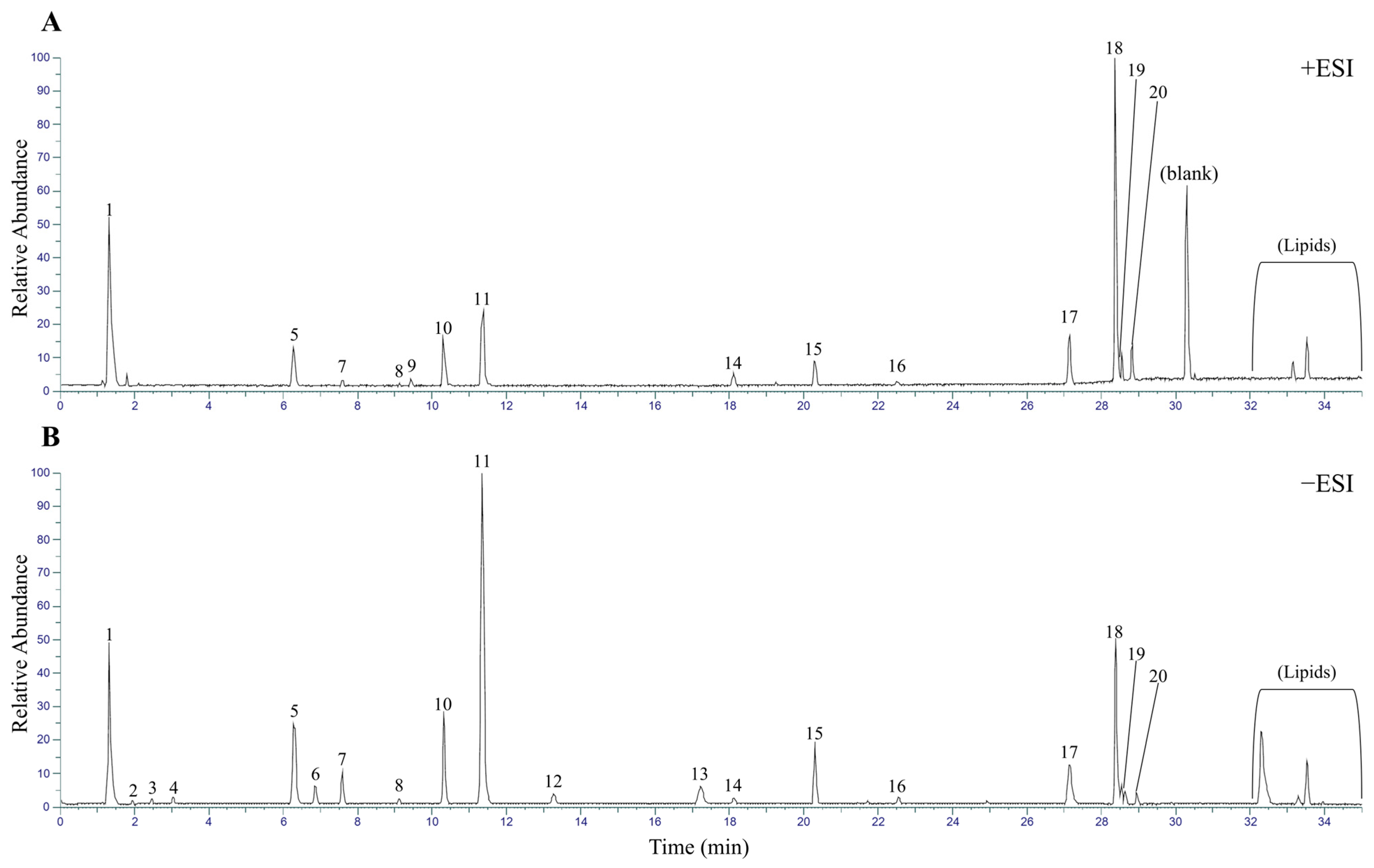 4.2. UHPLC–MS/MS Analysis & Metabolite Identification