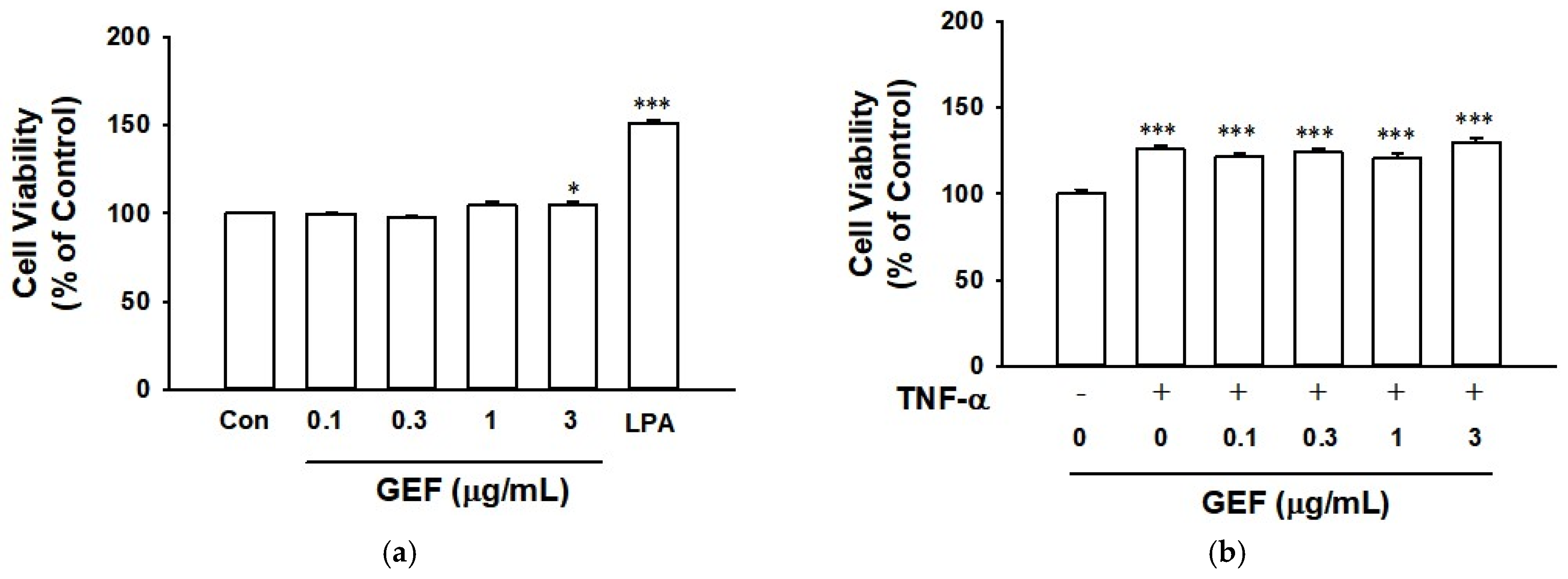 2.1. Effect of GEF and TNF-α on Cell Viability of HaCaT Cells