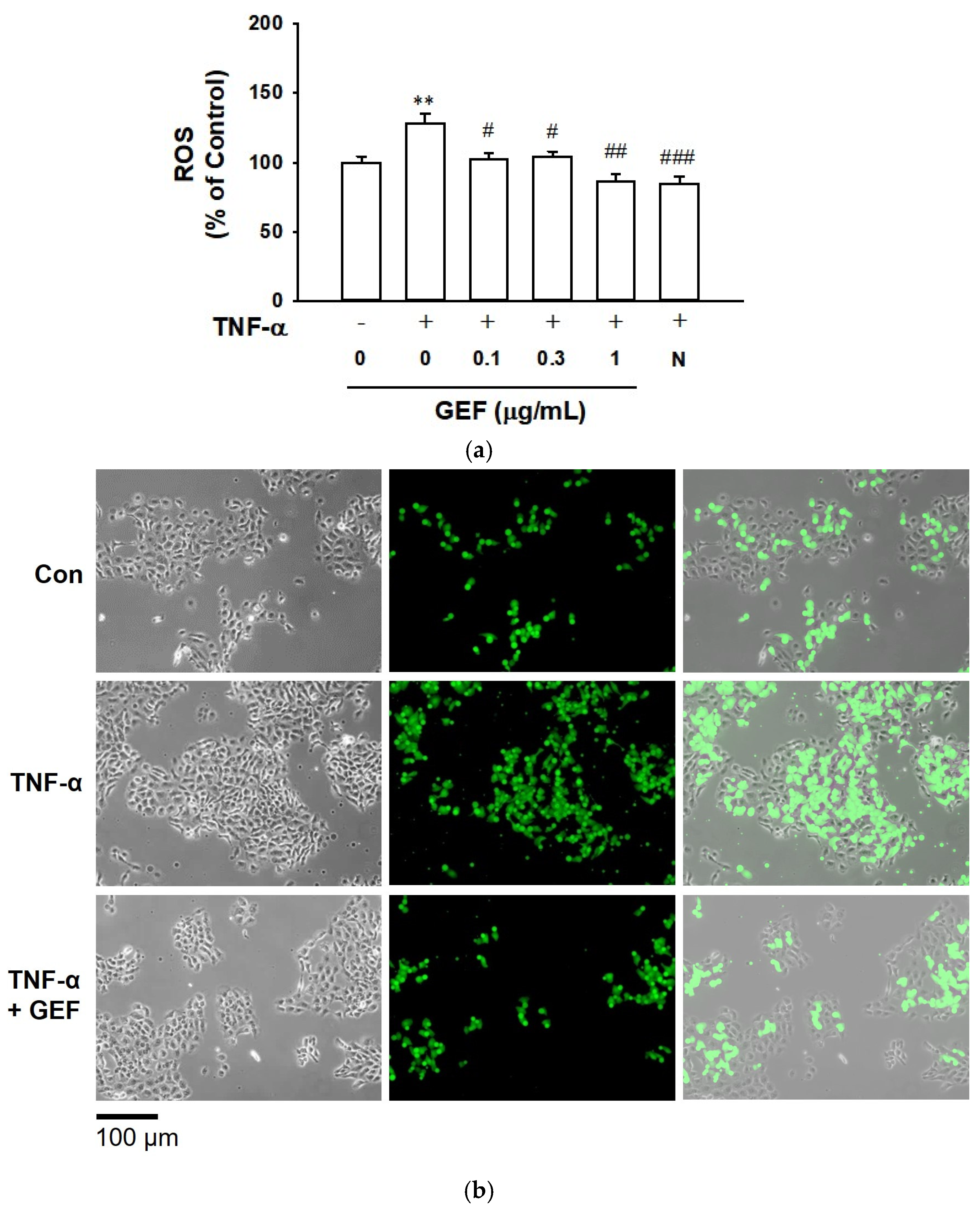 2.2. Effect of GEF on TNF-α-Induced ROS Production in HaCaT Cells