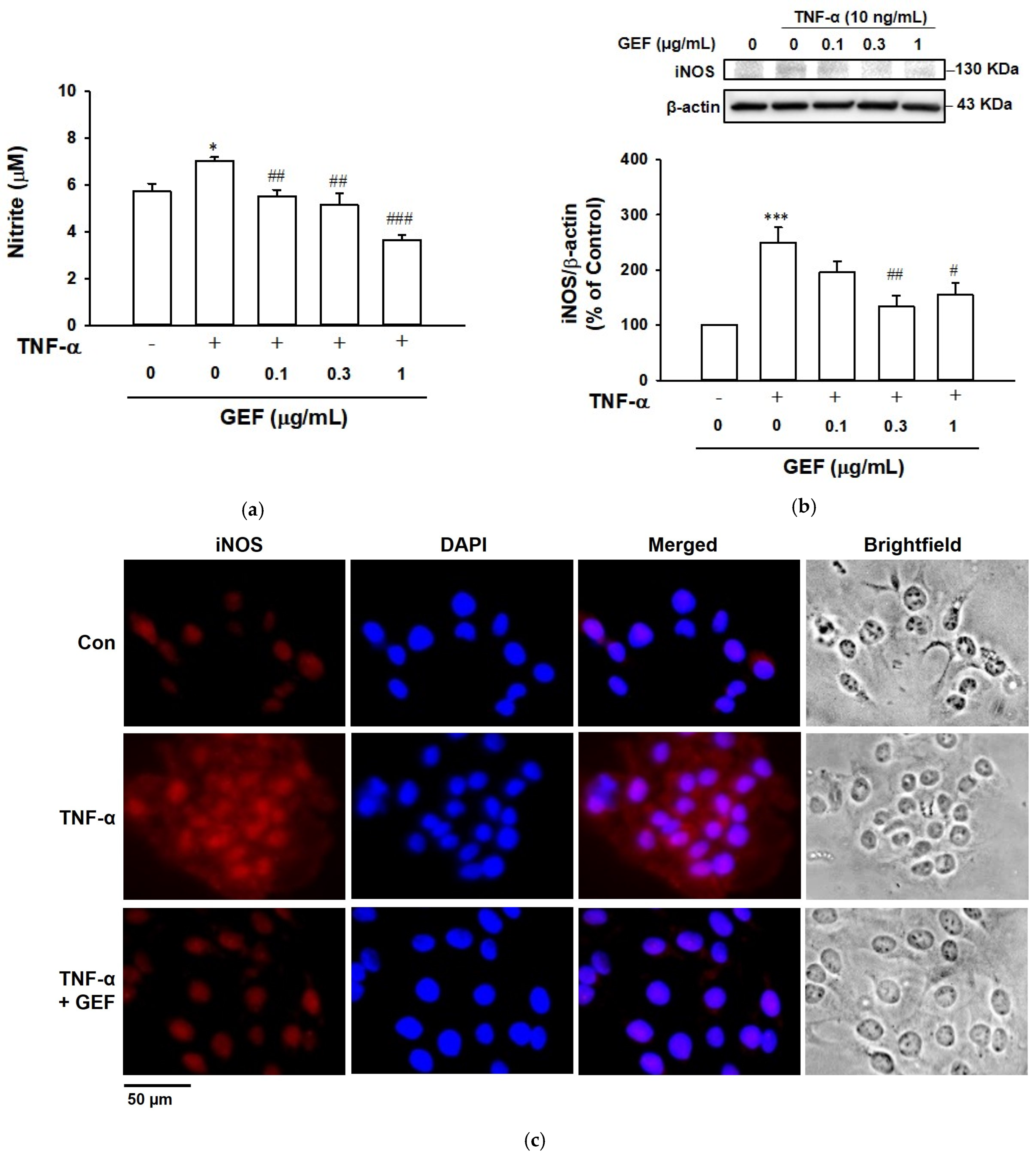 2.3. Effect of GEF on TNF-α-Induced NO Release in HaCaT Cells