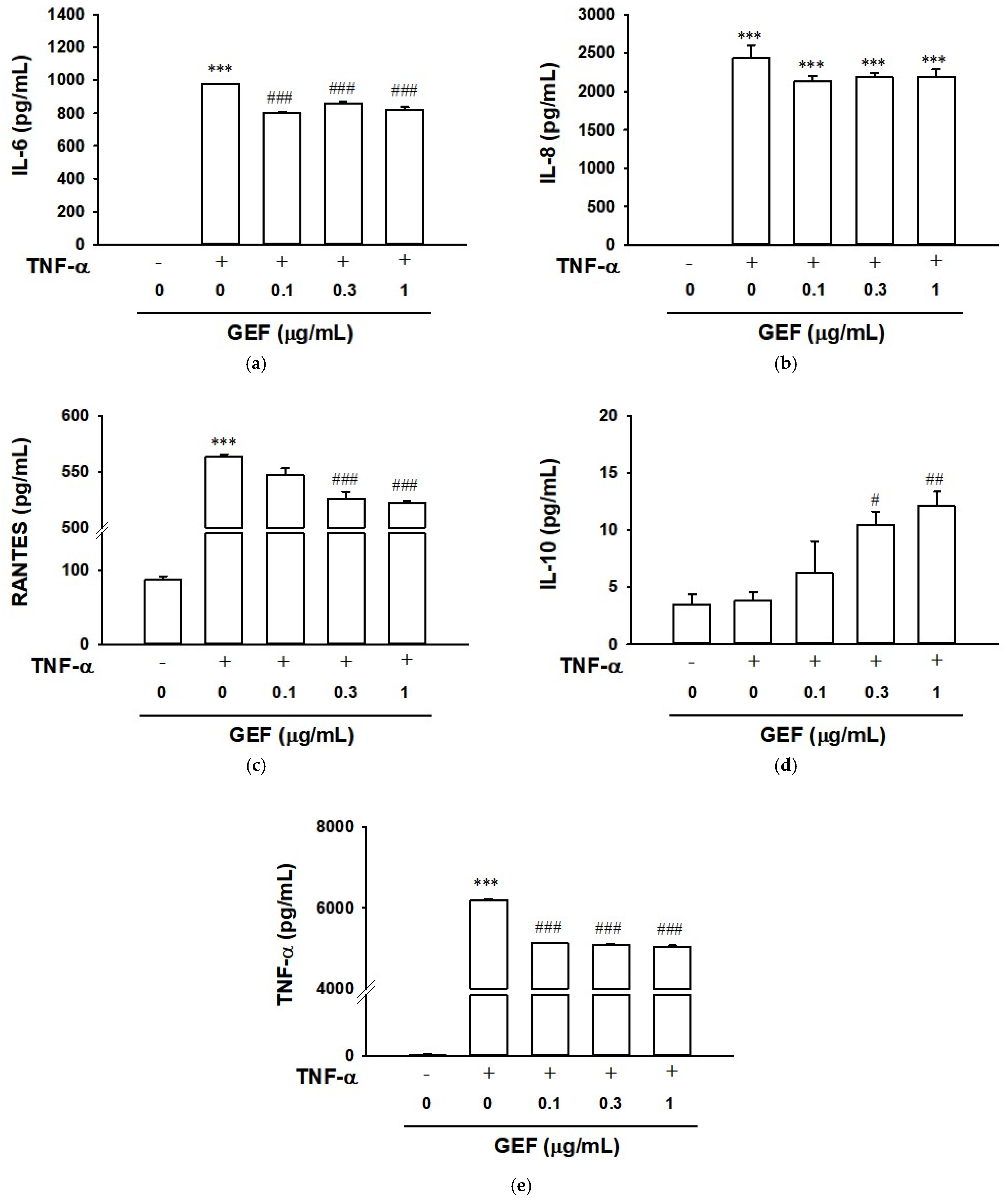 2.4. Effect of GEF on TNF-α-Induced Cytokine Release in HaCaT Cells