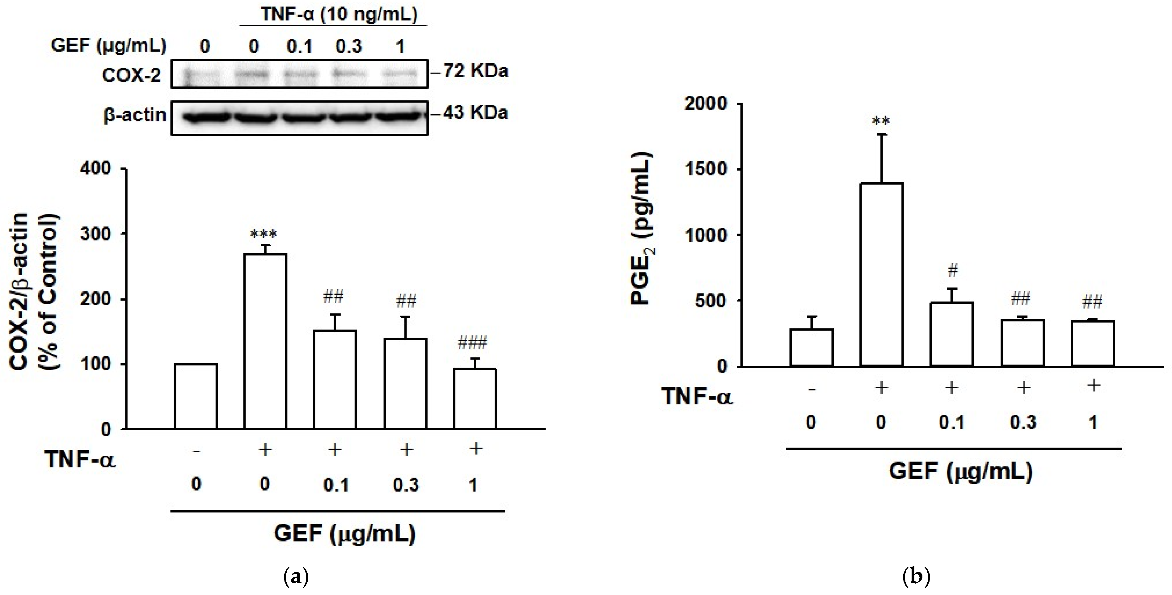 2.5. Effect of GEF on TNF-α-Induced COX-2 and Prostaglandin E2 Expression in HaCaT Cells