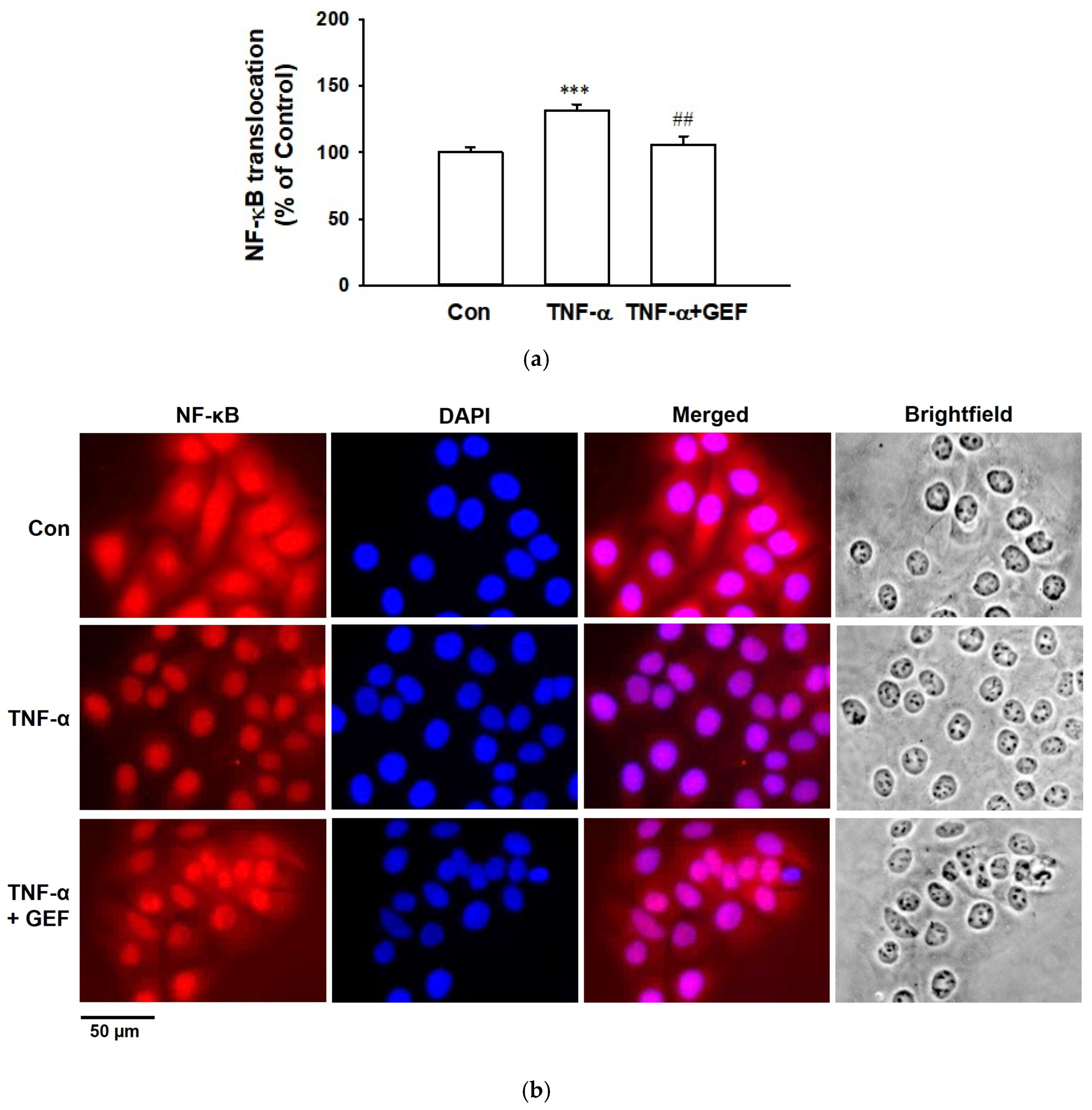 2.6. Effect of GEF on TNF-α-Induced Translocation of NF-κB in HaCaT Cells
