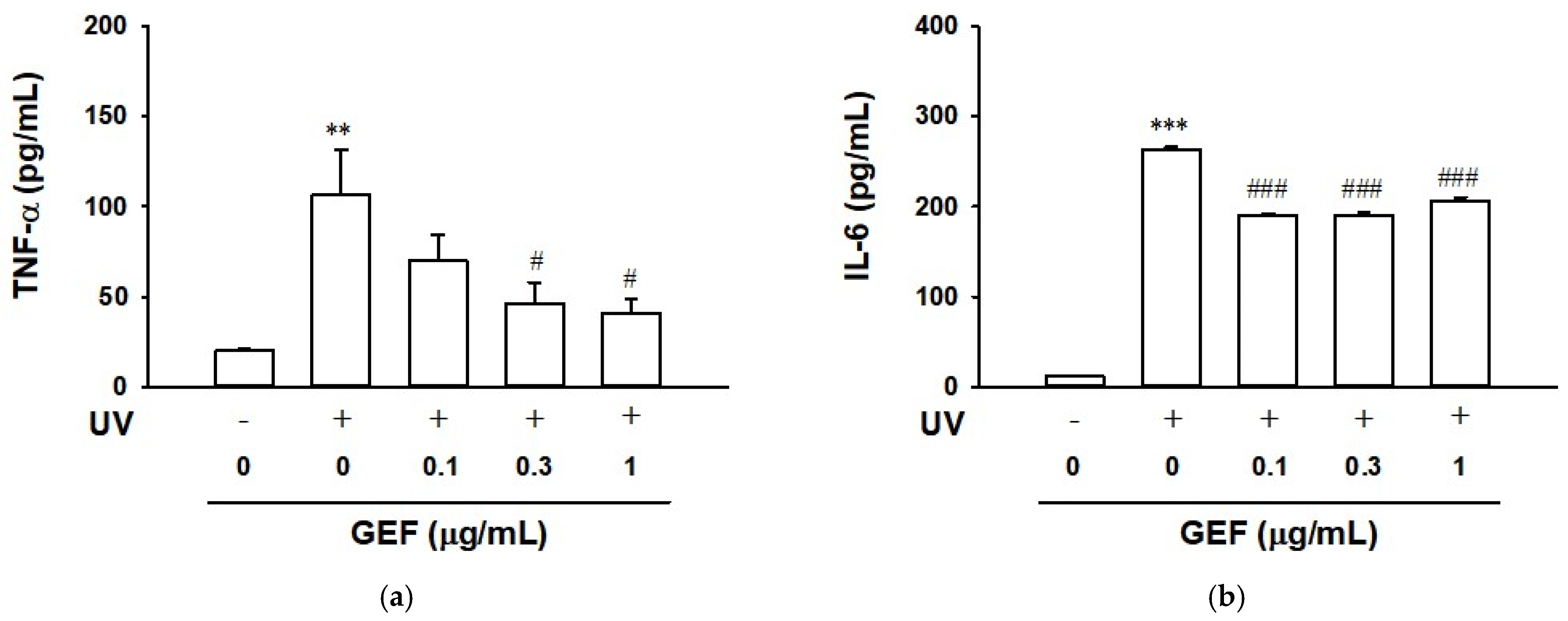 2.7. Effect of GEF on Cytokine Release in Ultraviolet-Irradiated HaCaT Cells