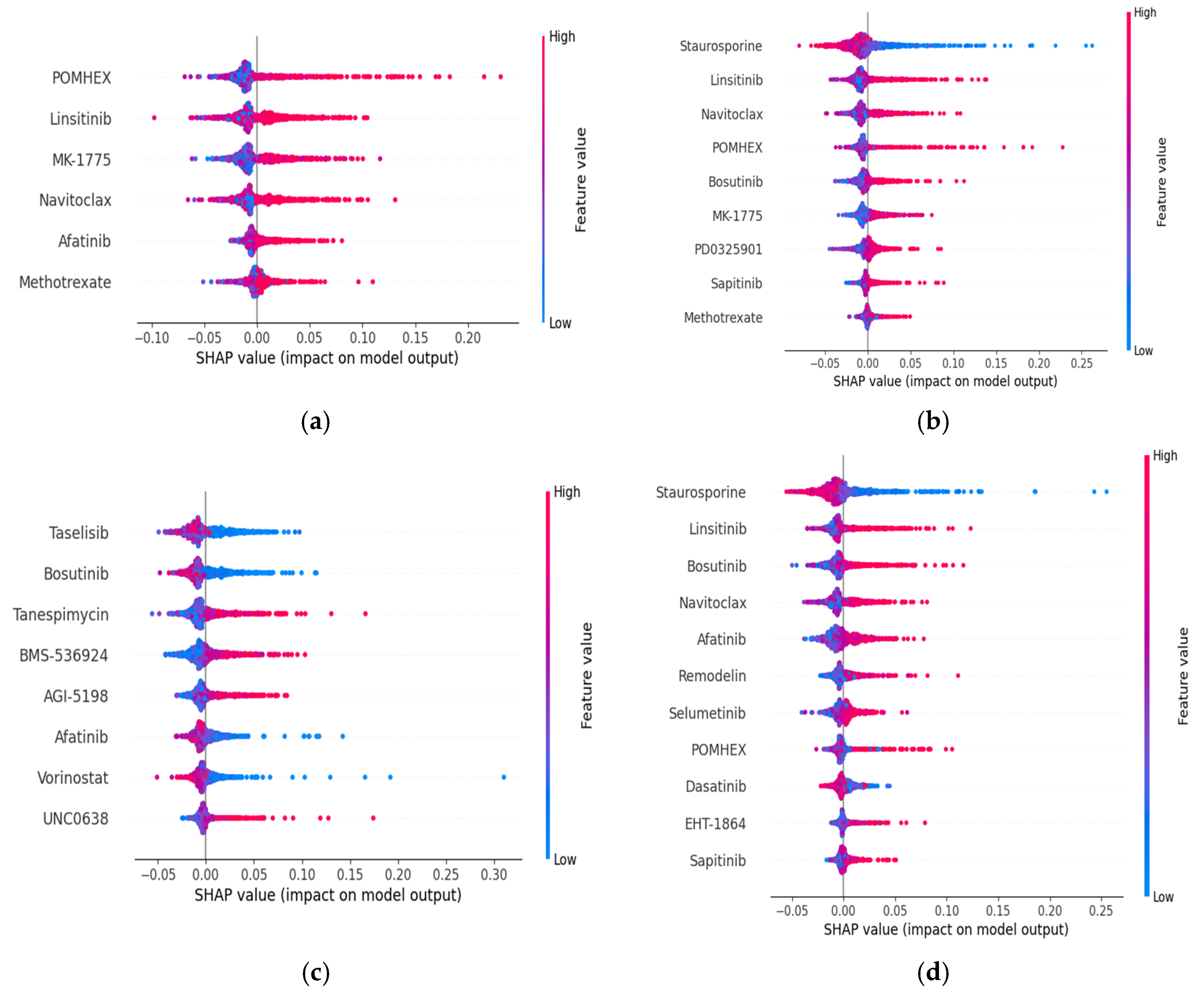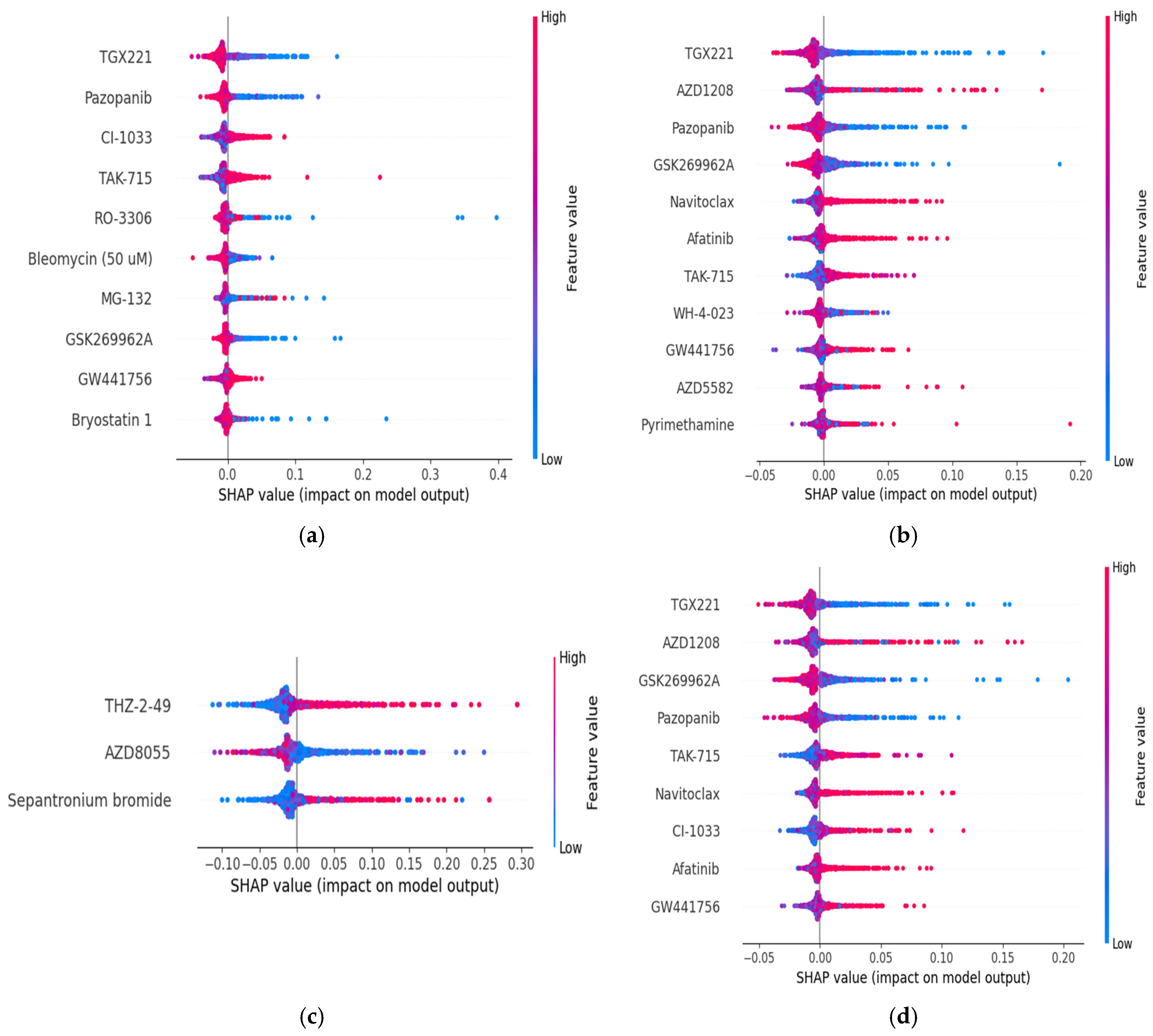 - To observe the impact of the selected feature set of GBM cell lines on model prediction performance for each dataset and drug sensitivity metric, we plotted SHAP (SHapley Additive exPlanations)-based plots.