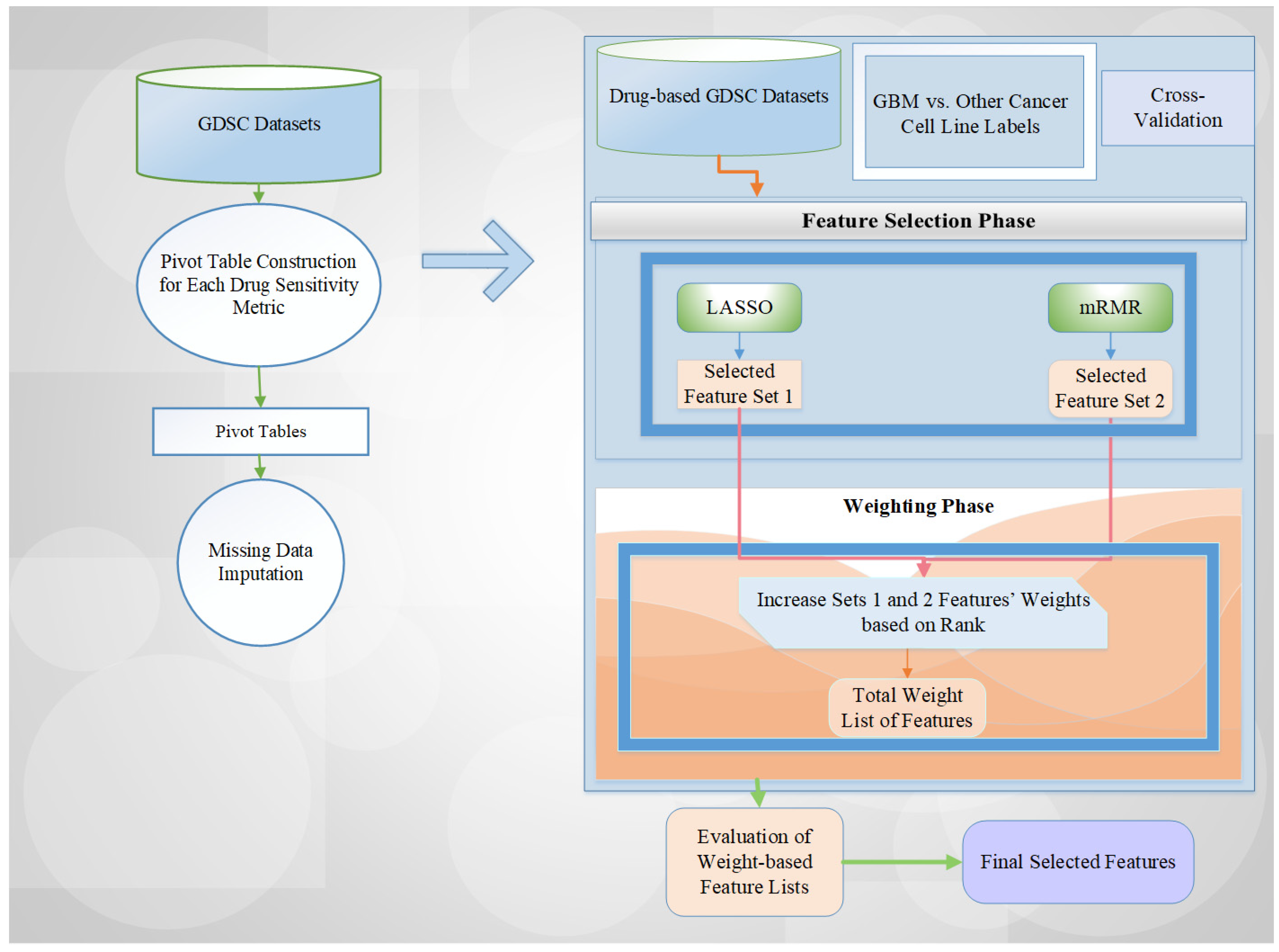 - To the best of our knowledge, this is the first study that employs a combined feature selection and weighting methodology to select drug compounds by discriminating GBM cell lines versus other cell lines by employing four drug sensitivity metrics separately, namely, LN_IC50 (Half Maximal Inhibitory Concentration), AUC (Area Under the Curve), RMSE (Root Mean Squared Error), and Z_SCORE (Standard score).