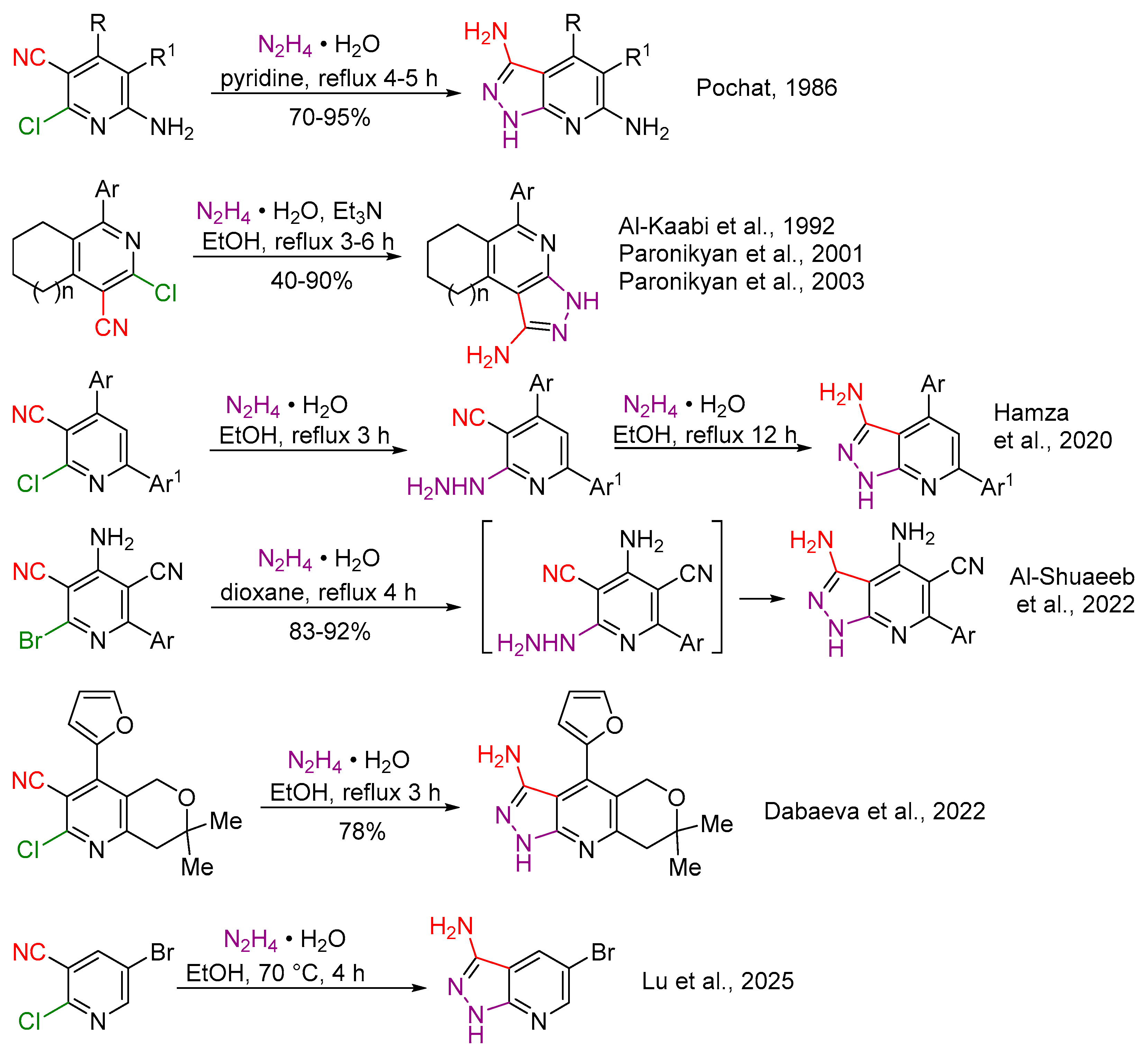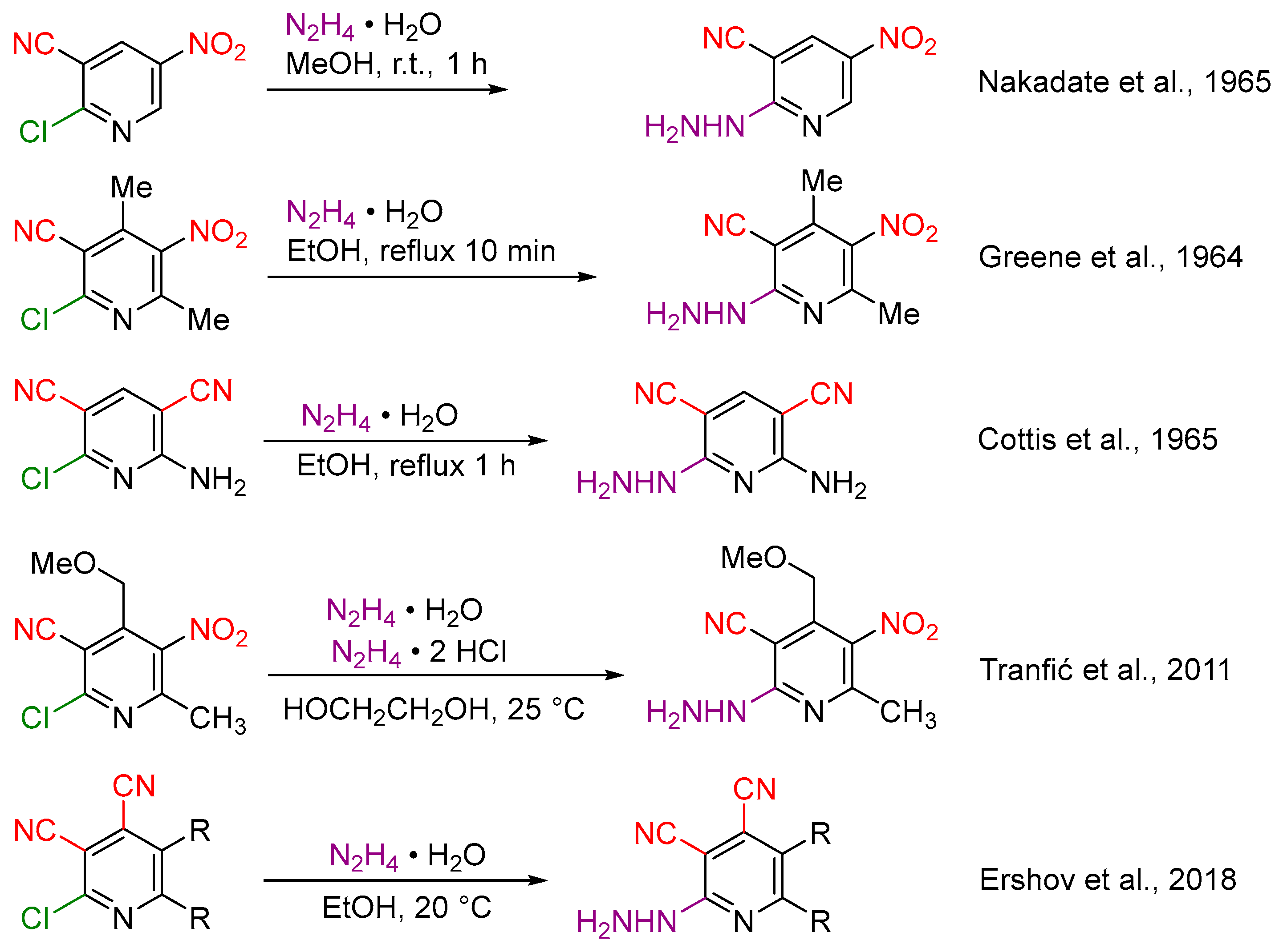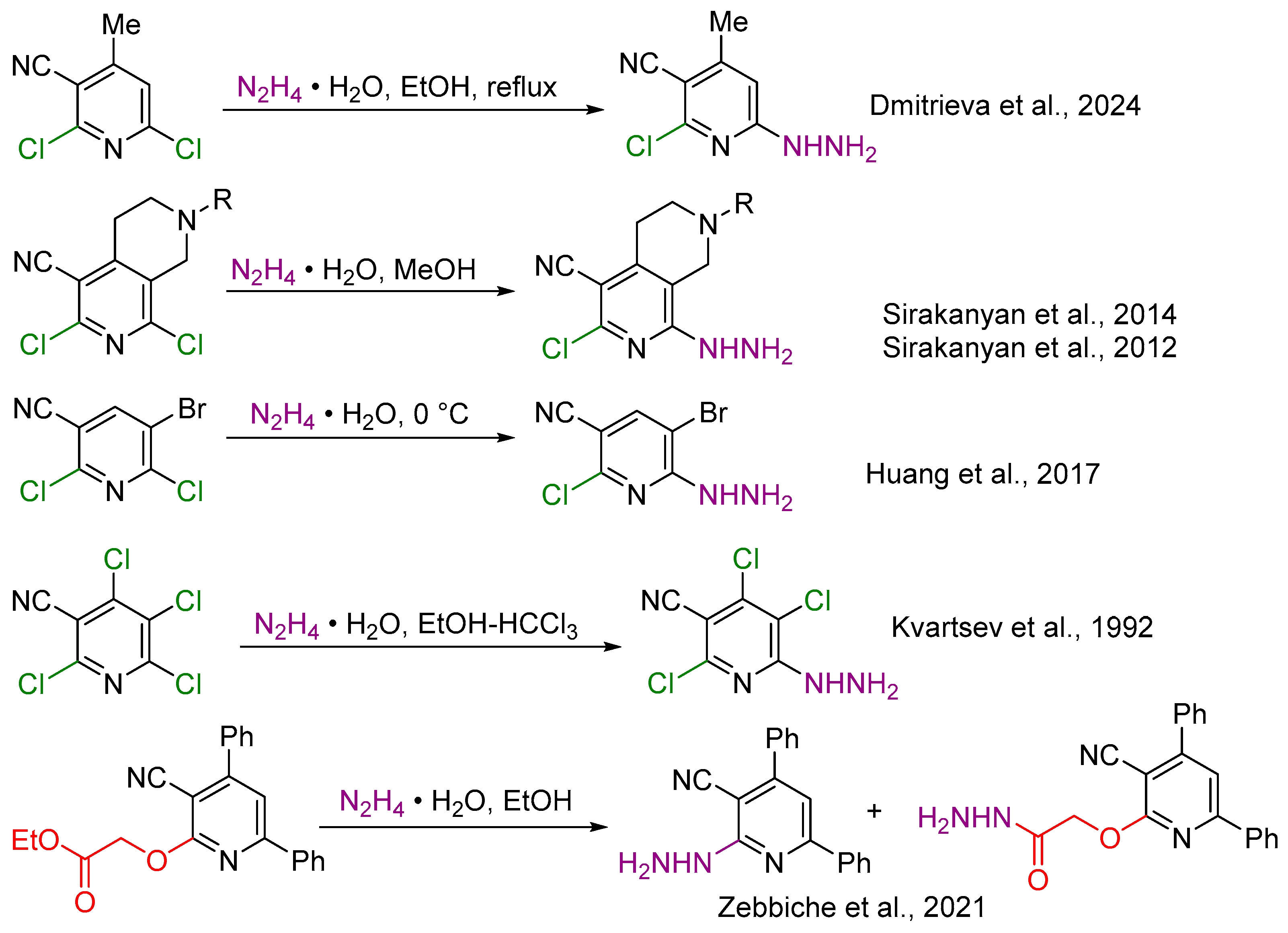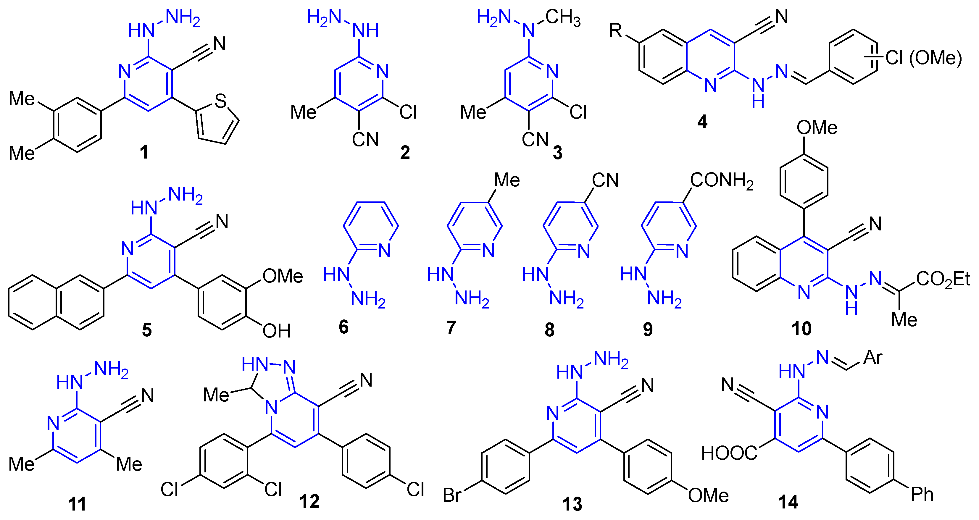 - Kvartsev, V.G.; Gizatullina, M.; Aliev, Z.G. Synthesis and structure of 6-hydrazinyl-2,4,5-trichloronicotinonitrile. Chem. Heterocycl. Compd. 1992, 28, 309–313. [Google Scholar] [CrossRef]
