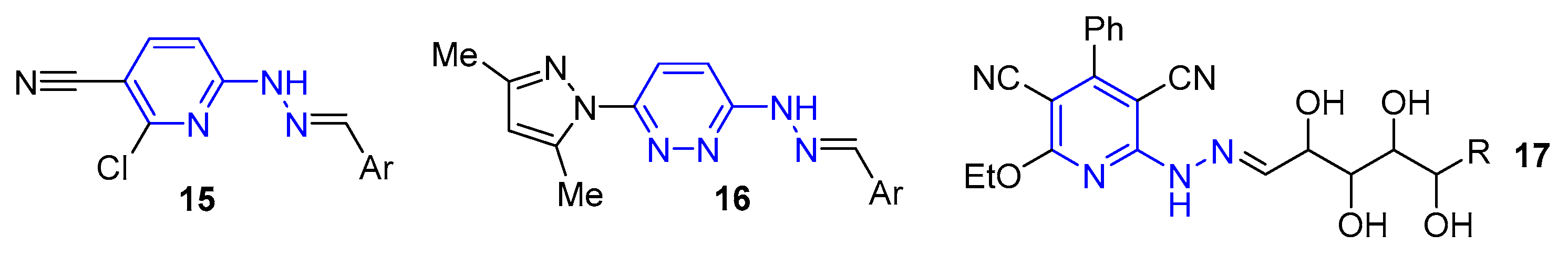 - Kobrakov, K.I.; Ruchkina, A.G.; Rybina, I.I. Methods for the synthesis of hydrazinylpyridines and some of their characteristics. (review). Chem. Heterocycl. Compd. 2003, 39, 283–307. [Google Scholar] [CrossRef]