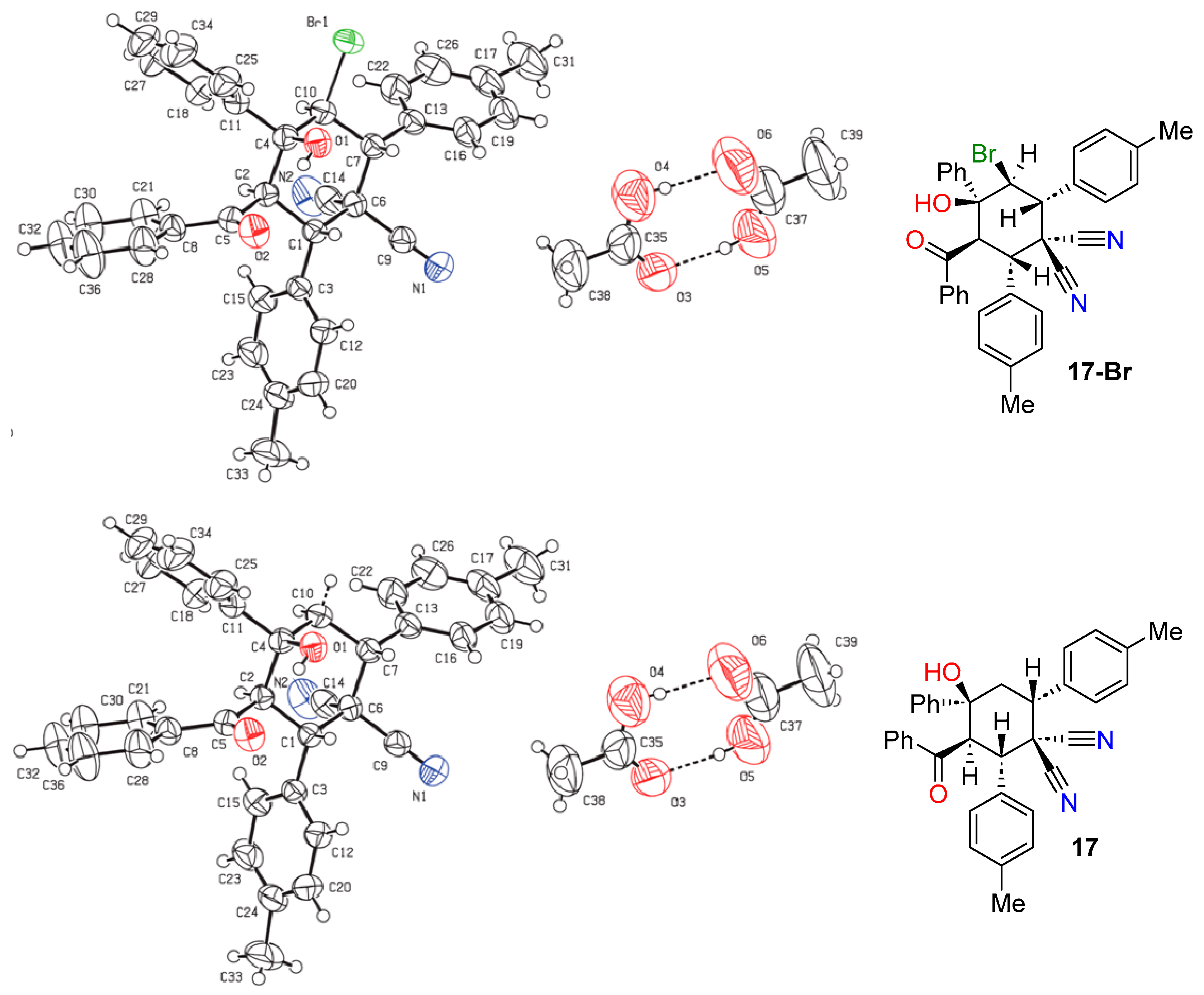 - Rong, L.C.; Li, X.Y.; Yang, F.; Wang, H.Y.; Shi, D.Q. 3-Benzoyl-4-hydroxy-2,4,6-triphenylcyclohexane-1,1-dicarbonitrile. Acta Crystallogr. E 2006, 62, o1766–o1767. [Google Scholar] [CrossRef]