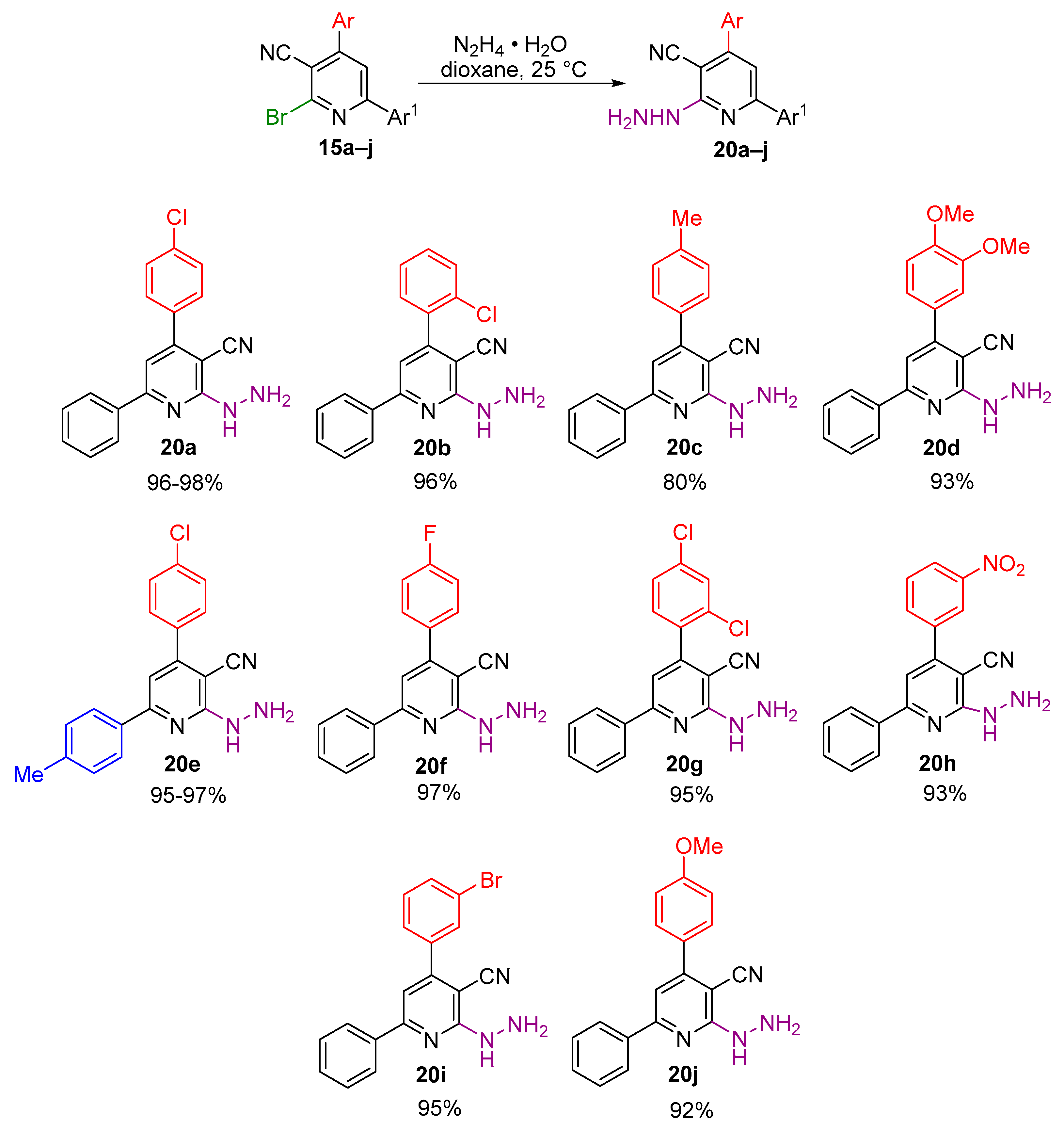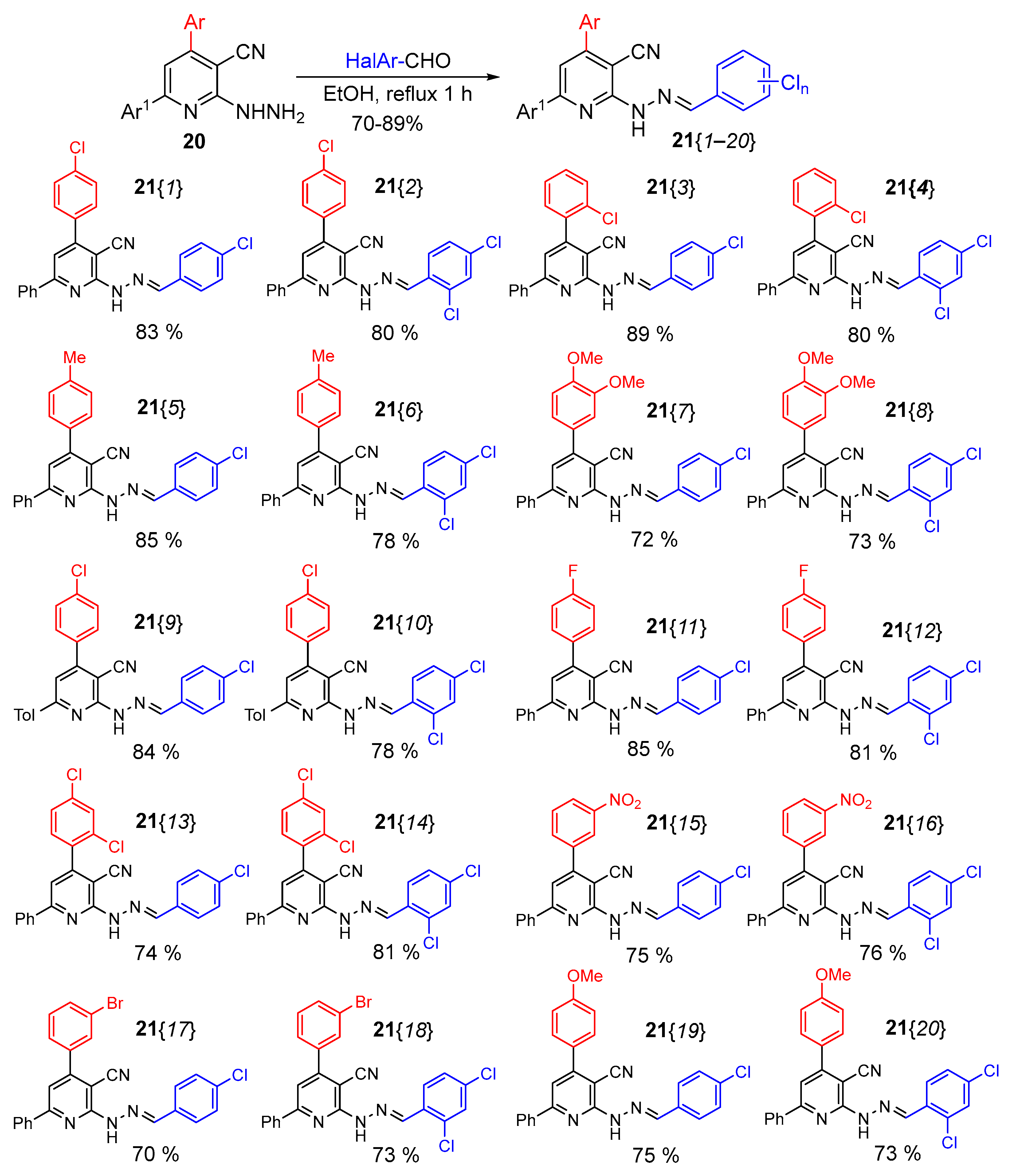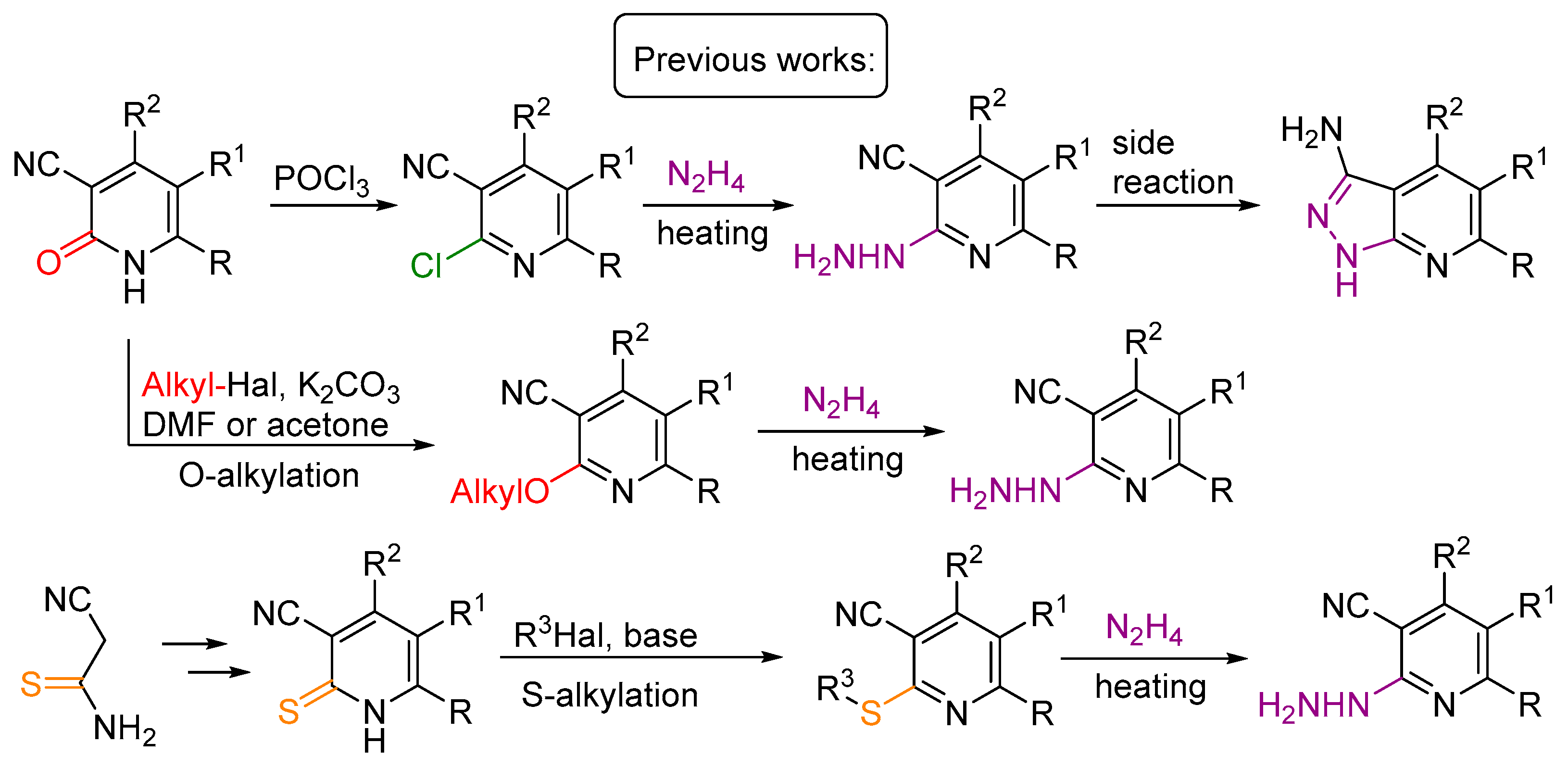 - Ershov, O.V.; Ievlev, M.Y.; Belikov, M.Y.; Maksimova, V.N. Synthesis of 2-Hydrazinylpyridine-3,4-dicarbonitriles and their Reaction with salicylaldehyde Derivatives. Russ. J. Org. Chem. 2018, 54, 873–877. [Google Scholar] [CrossRef]