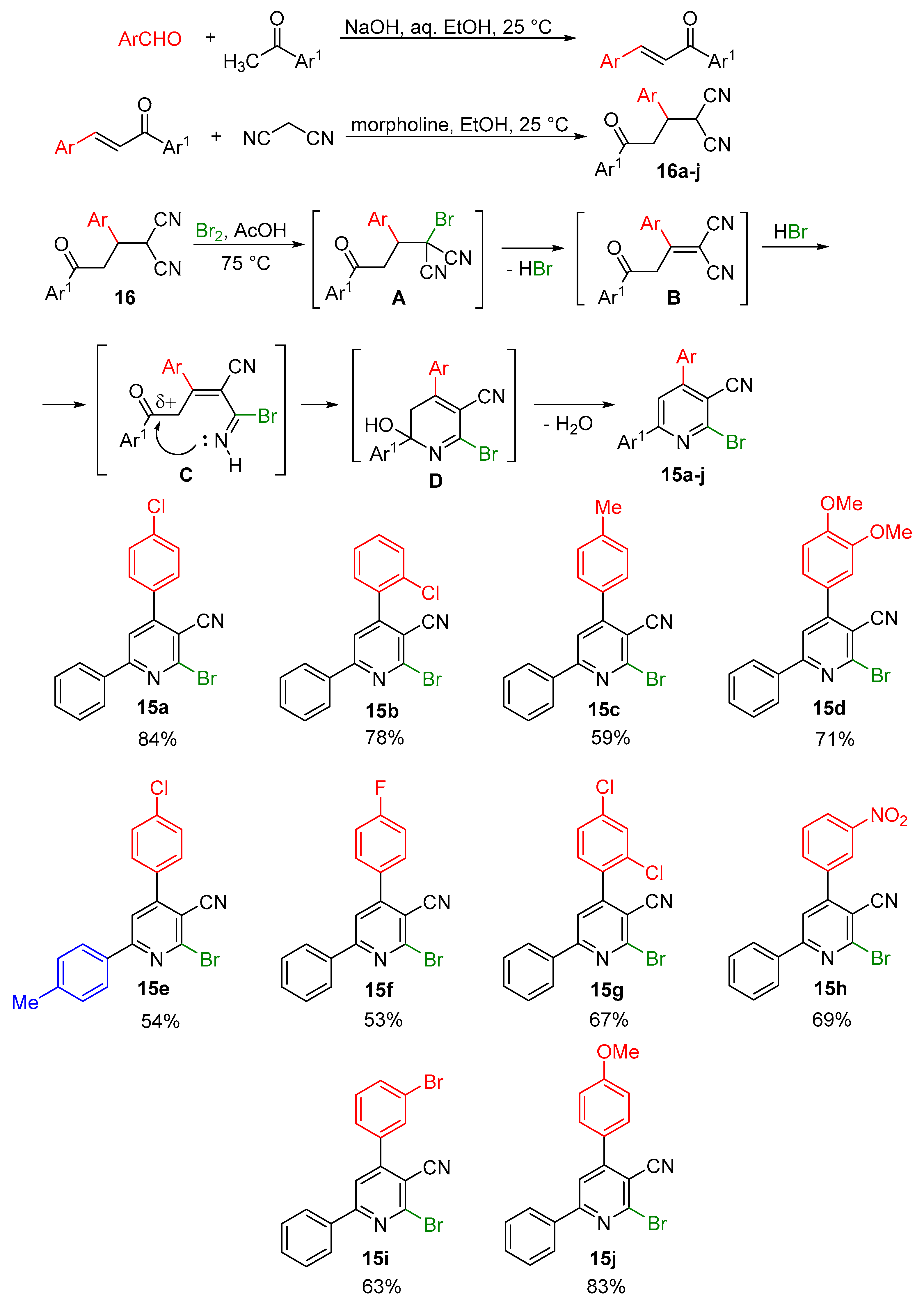 - Kuznetcova, A.V.; Odin, I.S.; Golovanov, A.A.; Grigorev, I.M.; Vasilyev, A.V. Multicomponent reaction of conjugated enynones with malononitrile and sodium alkoxides: Complex reaction mechanism of the formation of pyridine derivatives. Tetrahedron 2019, 75, 4516–4530. [Google Scholar] [CrossRef]