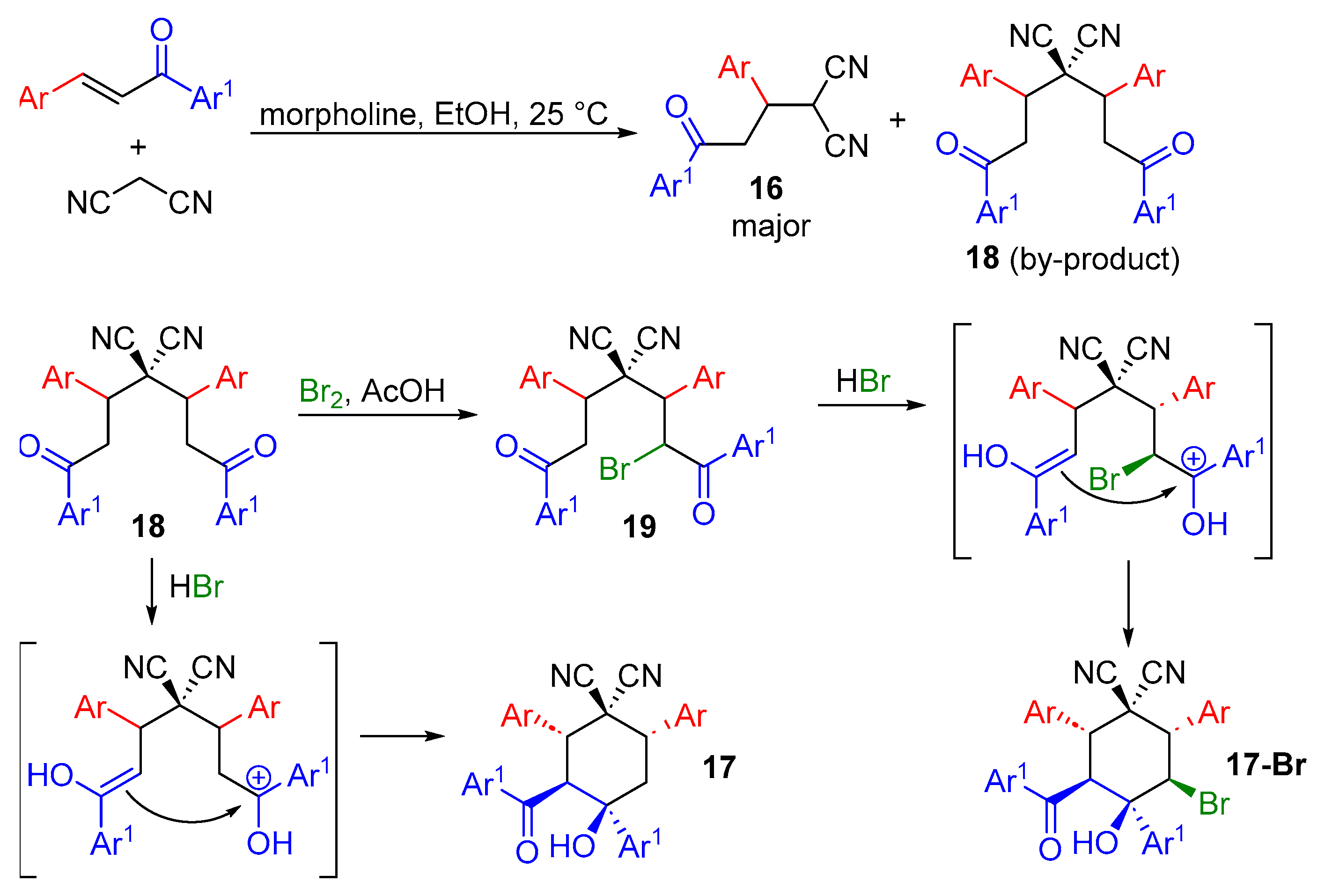 - Al-Arab, M.M.; Tabba, H.D.; Ghanem, B.S.; Olmstead, M.M. Michael-addition of malononitrile to 1,3-diaryl-2-propen-1-ones. Synthesis 1990, 1990, 1157–1159. [Google Scholar] [CrossRef]
