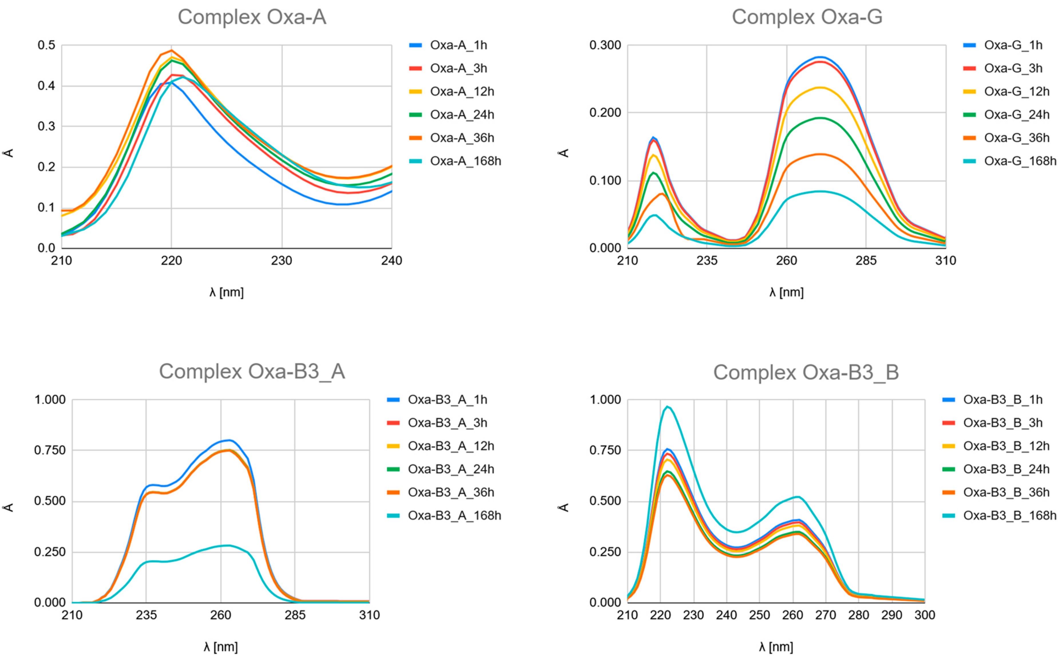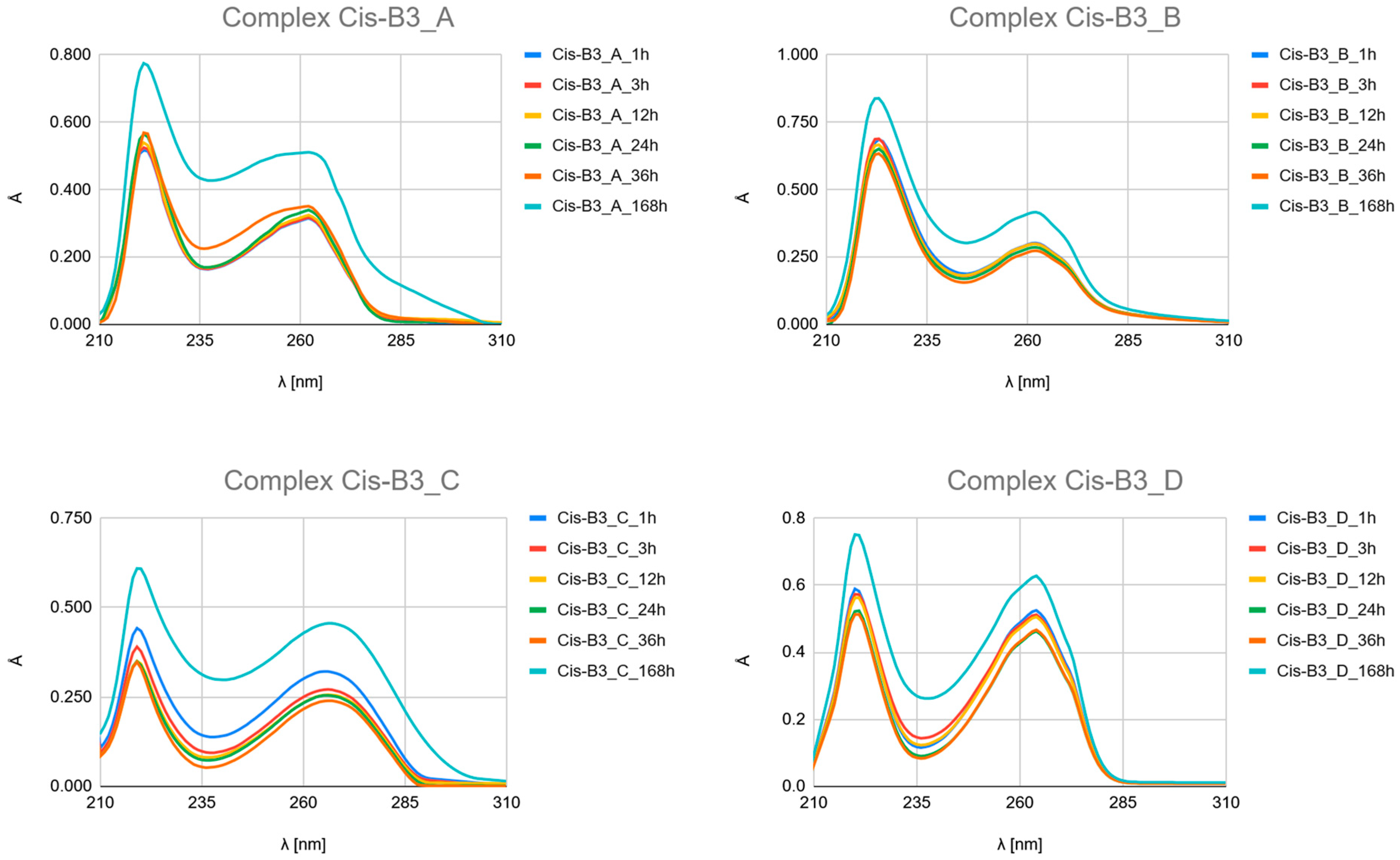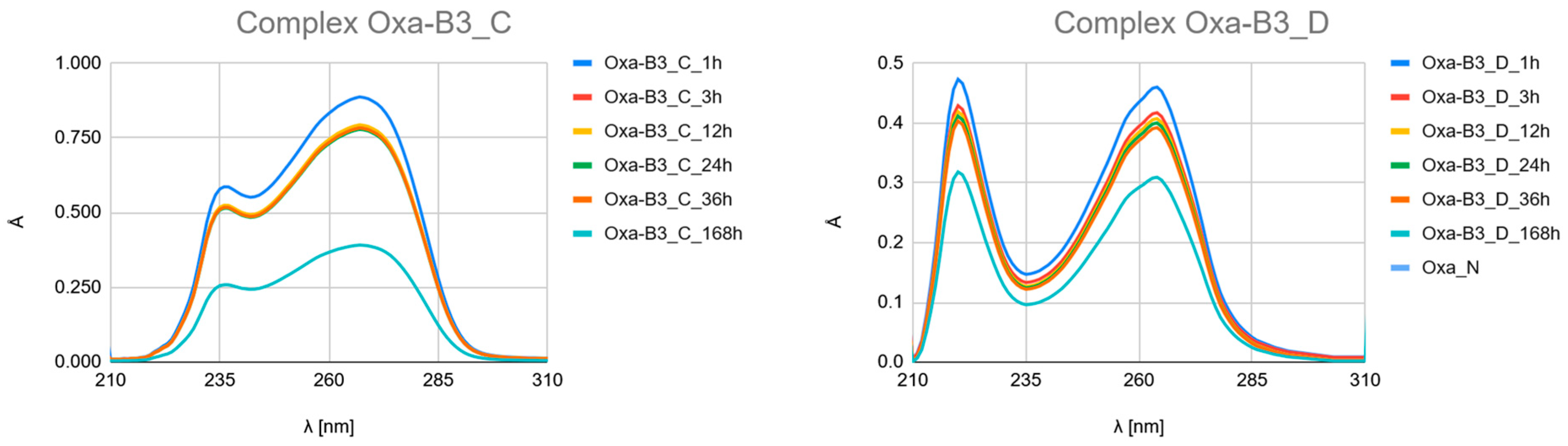 - Kinetic Outlier (Picolinic Acid, B3_D): Picolinic acid (B3_D) exhibits the most significant spectral evolution, characterized by a substantial and rapid increase in absorbance (e.g., around 220 nm and 265 nm) over time (Figure 7, Figure 8 and Figure 9, Figures S10, S17 and S24). This pronounced change is indicative of a high kinetic preference and rapid formation of a stable, chromophoric chelate complex. This kinetic superiority, however, contrasts sharply with the computational thermodynamic data.