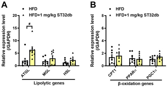 ST32db upregulated the mRNA levels of lipolytic genes in the liver of HFD-fed mice. (A) The mRNA levels of lipolytic genes, including ATGL, MGL, and HSL and (B) β-oxidation genes, including Cpt1, PPARα, and PGC1α, were measured by a real-time PCR analysis. Data are presented as the mean ± SEM (n = 8) and analyzed by one-way ANOVA. # p < 0.05 compared to the HFD group.