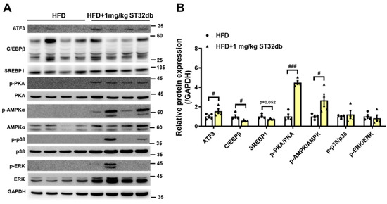 (A) Western blot and (B) densitometry quantification showing effects of ST32db on protein expression of ATF3; C/EBPβ; and phosphorylated form of AMPK, PKA, p38, and ERK in the liver of HFD-fed mice. The protein levels were measured by Western blot. Data are presented as mean ± SEM (n = 4) and analyzed by one-way ANOVA. # p < 0.05 and ### p < 0.001 compared to HFD group.