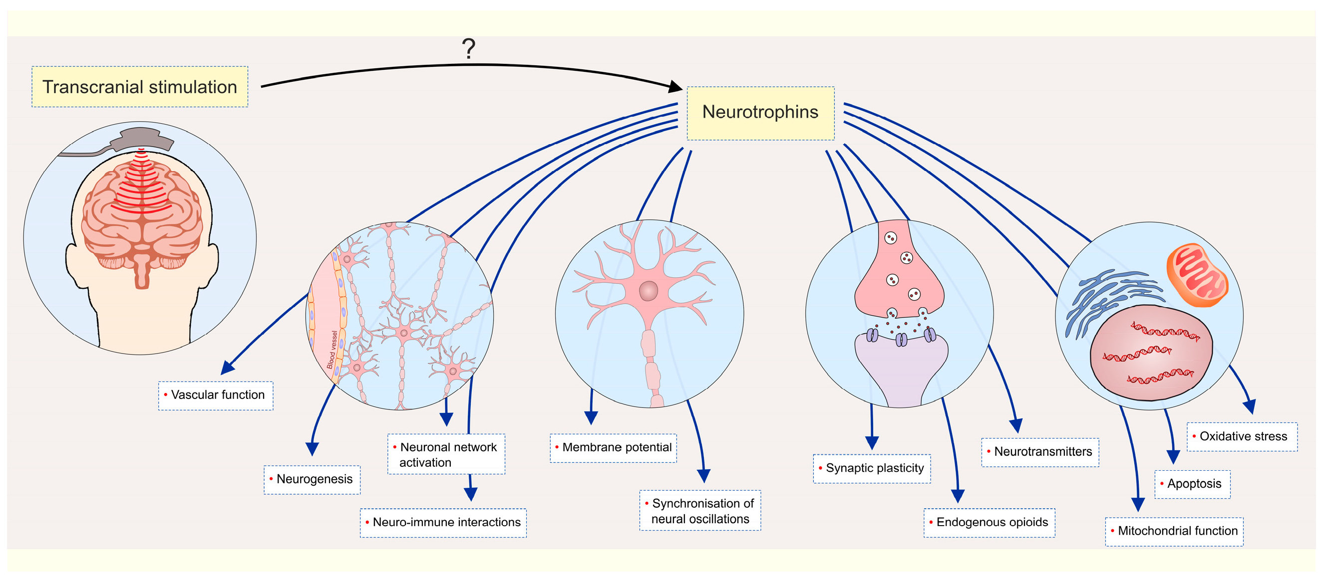 | Transcranial direct and alternating current stimulation (tDCS, tACS) | - membrane potentials modulation - neurotransmitter modulation - oscillations synchronization | Vagus nerve stimulation (VNS) | - neurotransmitter modulation - increased neuroplasticity - anti-inflammatory and anti-apoptotic action |