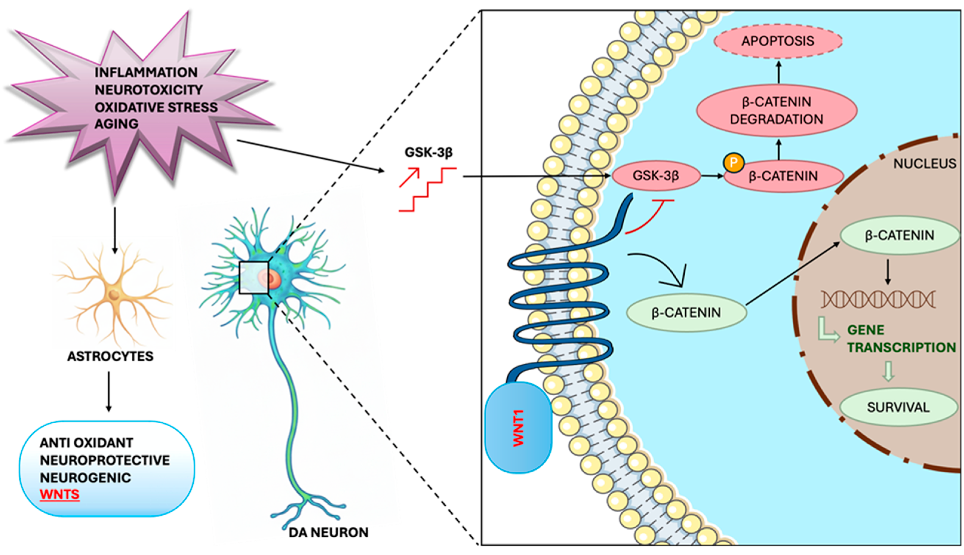 - L’episcopo, F.; Serapide, M.F.; Tirolo, C.; Testa, N.; Caniglia, S.; Morale, M.C.; Pluchino, S.; Marchetti, B. A Wnt1 Regulated Frizzled-1/β-Catenin Signaling Pathway as a Candidate Regulatory Circuit Controlling Mesencephalic Dopaminergic Neuron-Astrocyte Crosstalk: Therapeutical Relevance for Neuron Survival and Neuroprotection. Mol. Neurodegener. 2011, 6, 49. [Google Scholar] [CrossRef]