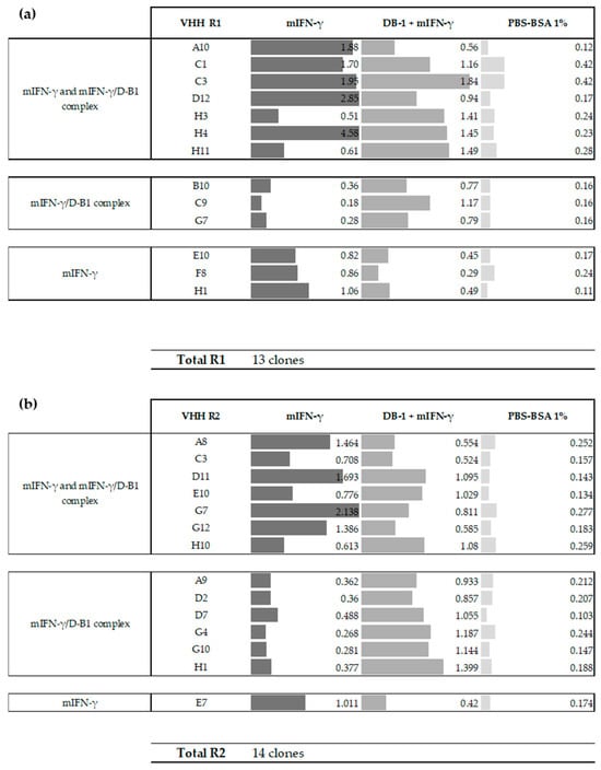 ELISA binding profiles of the 27 positive VHH clones against murine IFN-γ (#210127) and the IFN-γ/DB-1 (#CT032 U-Cytech) complex. (a) Values represent OD450nm for 13 VHH clones from round 1 (R1); (b) values represent OD450nm for 14 VHH clones from round 2 (R2).