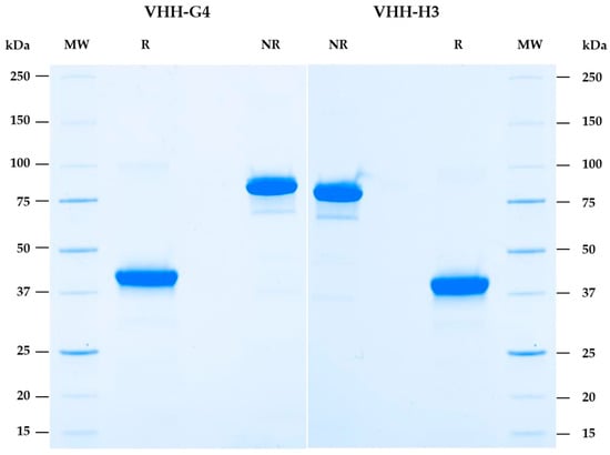 Visualization of the purified VHH-hFC mAbs. A total of 2 µg of each purified candidate (G4 and H3) was used for the SDS-PAGE visualization. R, reduced form; NR, non-reduced form; MW, molecular weight marker. After reduction, the VHH-hFC monomeric form showed sizes close to 40 kDa. In non-reduced conditions, the dimeric molecules showed sizes close to 80–90 kDa.