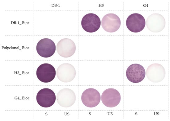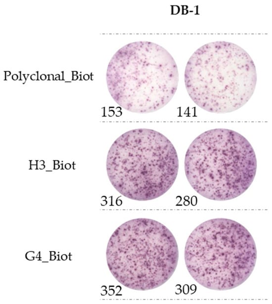 Based on those results, it was decided to keep DB-1 as the capture antibody and continue to test H3 and G4 as detection antibodies at different concentrations. With optimal concentration (25 ng/well), both antibodies showed similar results with a better sensitivity than the rabbit polyclonal antibody, with mean values of 301 and 330 spots, respectively, compared to 147 spots for the polyclonal (Figure 5). Both options (DB-1/H3_Biot or DB-1/G4_Biot) show a better performance than our previous pair (DB-1/Polyclonal_Biot).
