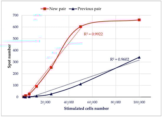 Finally, we compared the sensitivity and linearity of our ELISpot assay using the previous antibody pair (DB-1/Polyclonal_Biot) versus the new pair (DB-1/G4_Biot). Sensitivity was assessed by the number of spots detected, while linearity was evaluated by the correlation between the number of stimulated cells and the detected spots. As shown in Figure 6, the new antibody pair demonstrated improved sensitivity, detecting approximately 650 spots compared to 350 spots for the previous pair using 100,000 stimulated cells, and exhibited better linearity, with an R2 of 0.99 versus 0.96 for the previous pair.
