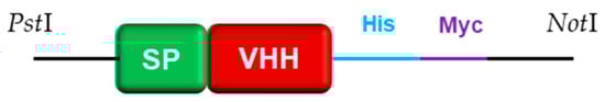 Representation of VHH construction in the phagemid adapted from Baurand et al. [11,12]. One signal peptide sequence (SP) is present before VHH sequences which are followed by a 6-histidine tag (His) and a Myc-tag (Myc) at the C-terminal part. The entire construction is cloned between PstI and NotI enzymatic restriction sites in a pCOMB3 vector.