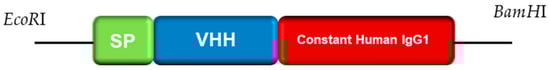 Representation of VHH-Fc design adapted from Baurand et al. [11,12]. The sequences were cloned in licensed vectors optimized for mammalian expression. The complete VHH-hFc was built with the variable nanobodies domain (VHH) from selected candidates and the constant part of the human constant IgG1 domain (Pro100-Lys330; accession number AXN93647.1). Constructions have a signal peptide (SP) upstream from the variable domains. The sequences of interest were cloned between the EcoRI and BamHI restriction sites.