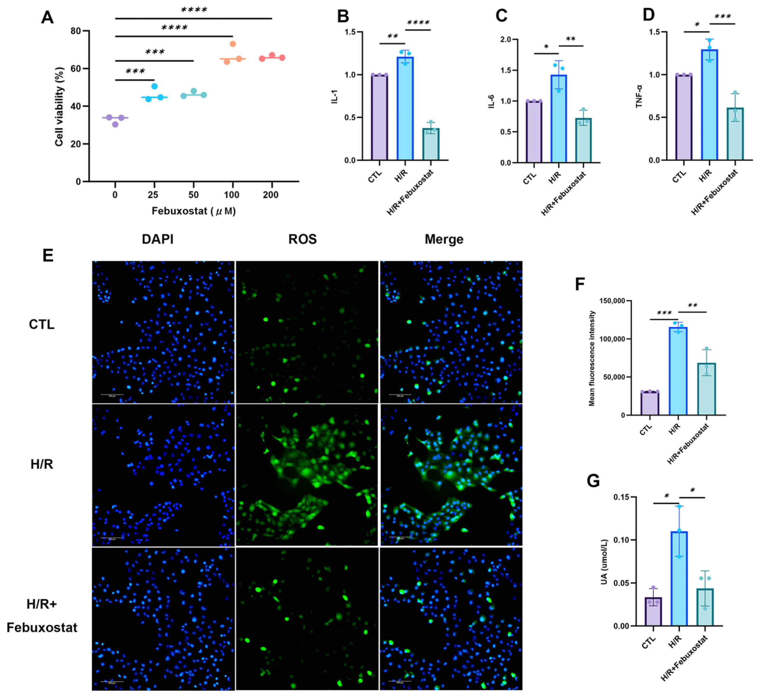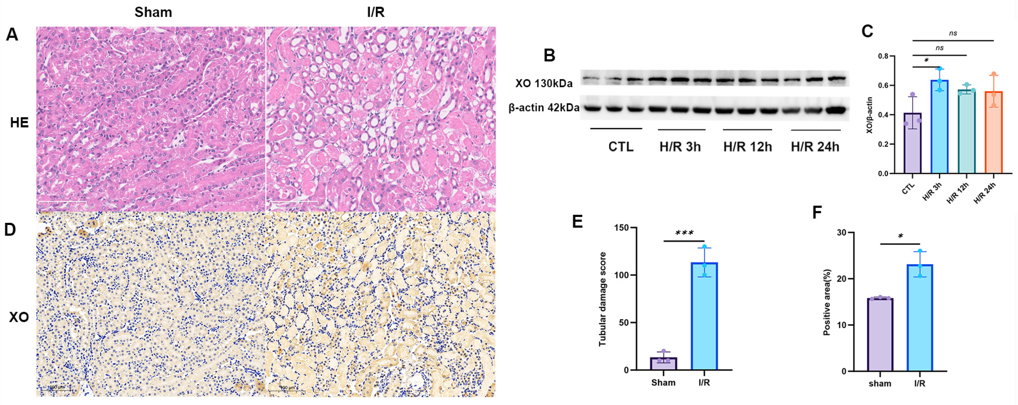 31]. Our experimental results demonstrated that in the human renal proximal tubular epithelial cell line HK-2 subjected to H/R, the levels of inflammatory factors were significantly elevated, XO expression was upregulated and peaked at 3 h after reoxygenation, accompanied by a marked increase in ROS levels. Similarly, significant upregulation of XO was observed in the kidneys of mice subjected to renal I/R. Clinical studies have revealed that marathon runners who developed AKI exhibited significantly greater increases in plasma xanthine and UA levels compared to those without AKI, and only the AKI group showed a notable elevation in plasma XOR activity [