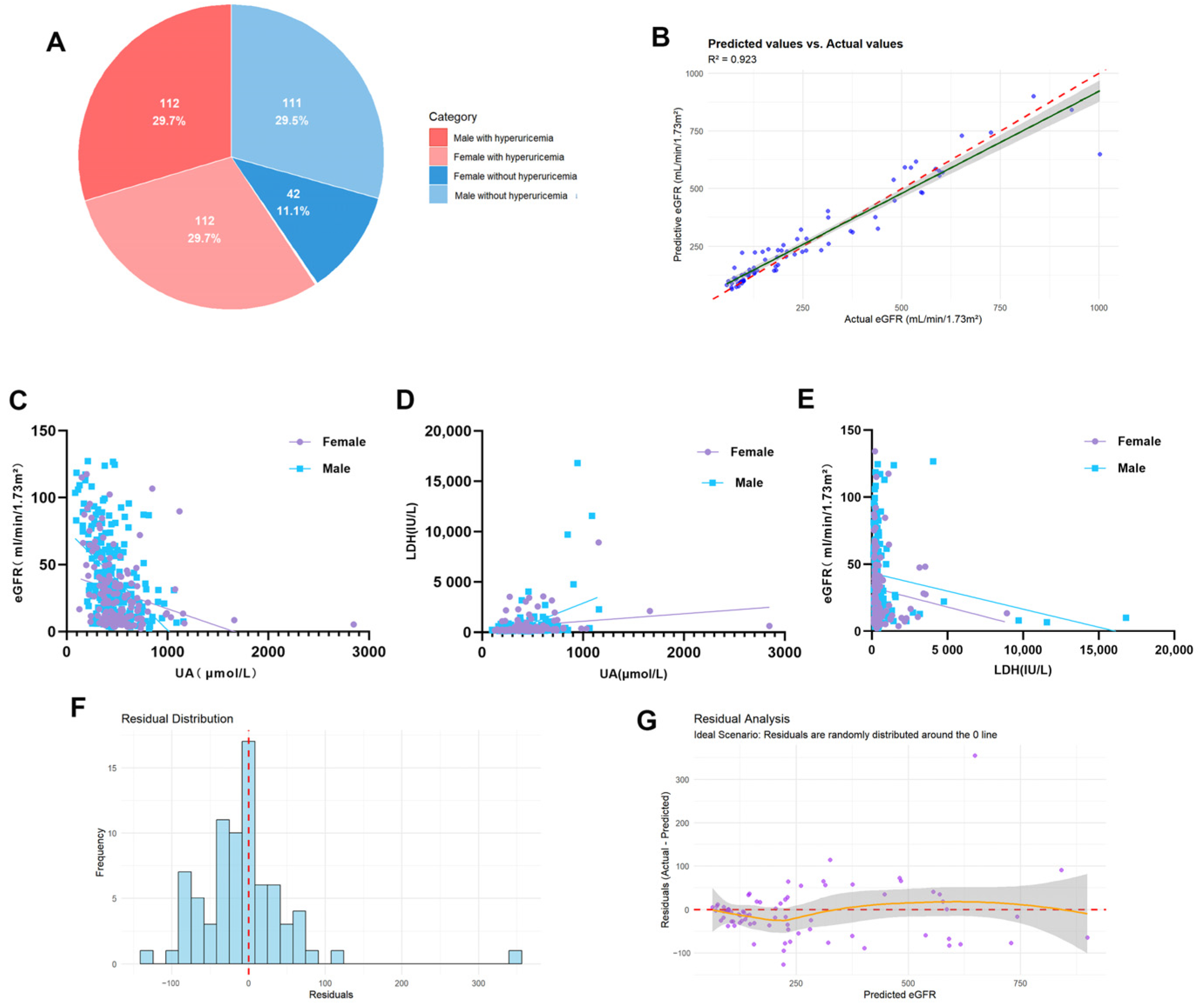 In the statistical tests, Pearson correlation coefficient and partial correlation coefficient were used to evaluate the correlations between UA and eGFR and LDH, as well as between LDH and eGFR. The correlation coefficient r is in the range of [−1, 1], and a p value < 0.05 indicates a significant correlation. A random forest algorithm was used to construct an eGFR prediction model using UA, LDH, age, diabetes, and hypertension as features. The prediction model was evaluated using residual distribution histograms and residual-prediction value plots. The data of this study are expressed as mean ± standard deviation. Analysis of variance (ANOVA) was used for multiple group comparisons, and a difference was considered statistically significant if p < 0.05.