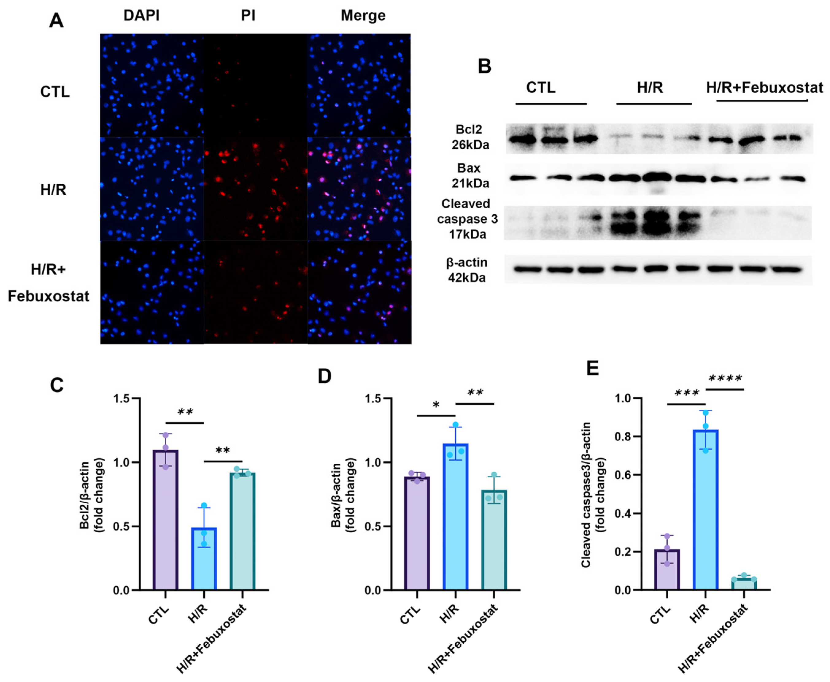 HK-2 cells were purchased from Procell Life Sciences and Technology Co., Ltd. (Wuhan, China). The cells were cultured in the MEM medium containing 5% fetal bovine serum and a penicillin–streptomycin–amphotericin B solution and maintained in a humidified environment at 37 °C with 5% carbon dioxide. When the cells reached 80% confluence, the H/R model was established. In brief, the cells were cultured under hypoxic conditions for 24 h (5% carbon dioxide, 1% oxygen, and 94% nitrogen), and then re-oxygenated under normal culture conditions for 3 h. Before inducing the H/R, HK-2 cells were pre-incubated with febuxostat (100 μM, MedChemExpress (Monmouth Junction, NJ, USA)) or PBS (Boster, Wuhan, China) (solvent control) for 3 h.