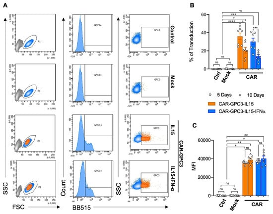 Generation of human primary NK cells harboring the fourth generation of GPC3-Specific CARs by lentiviral vector transduction. (A) Flow cytometric analysis of CAR expression on the surface of pure primary NK not transduced (control), transduced with lentiviral vector backbone (mock), transduced with CAR-GPC3-IL15, and GPC3-CAR-IL15-IFNα lentivirus with BB515-Labeled Human Glypican-3 protein. NK cells were gated on live cells according to morphology FSC/SSC. Data shown are representative of seven experiments with similar results. (B,C) Efficiency of transduction was traced on days 5 (dots) and 10 (triangles). Symbols (n = 7) represent the percentage of CAR-GPC3-IL15-NK (orange bars) and GPC3-CAR-IL15-IFNα-NK (blue bars) GPC3+ cells (B) and the mean fluorescence intensity (MFI, C). GFP (white bars) and mock (gray bars) were used as controls. (B,C) Statistical analyses were performed using a two-way ANOVA with the Kruskal–Wallis comparison test. * denotes significant intragroup differences (5 days vs. 10 Days), whereas # denotes significant differences between three major groups (Control, Mock and CARs). * p < 0.05, *** p < 0.001, # p < 0.05, ## p < 0.01, ### p < 0.001, #### p < 0.0001, ns non-significant.