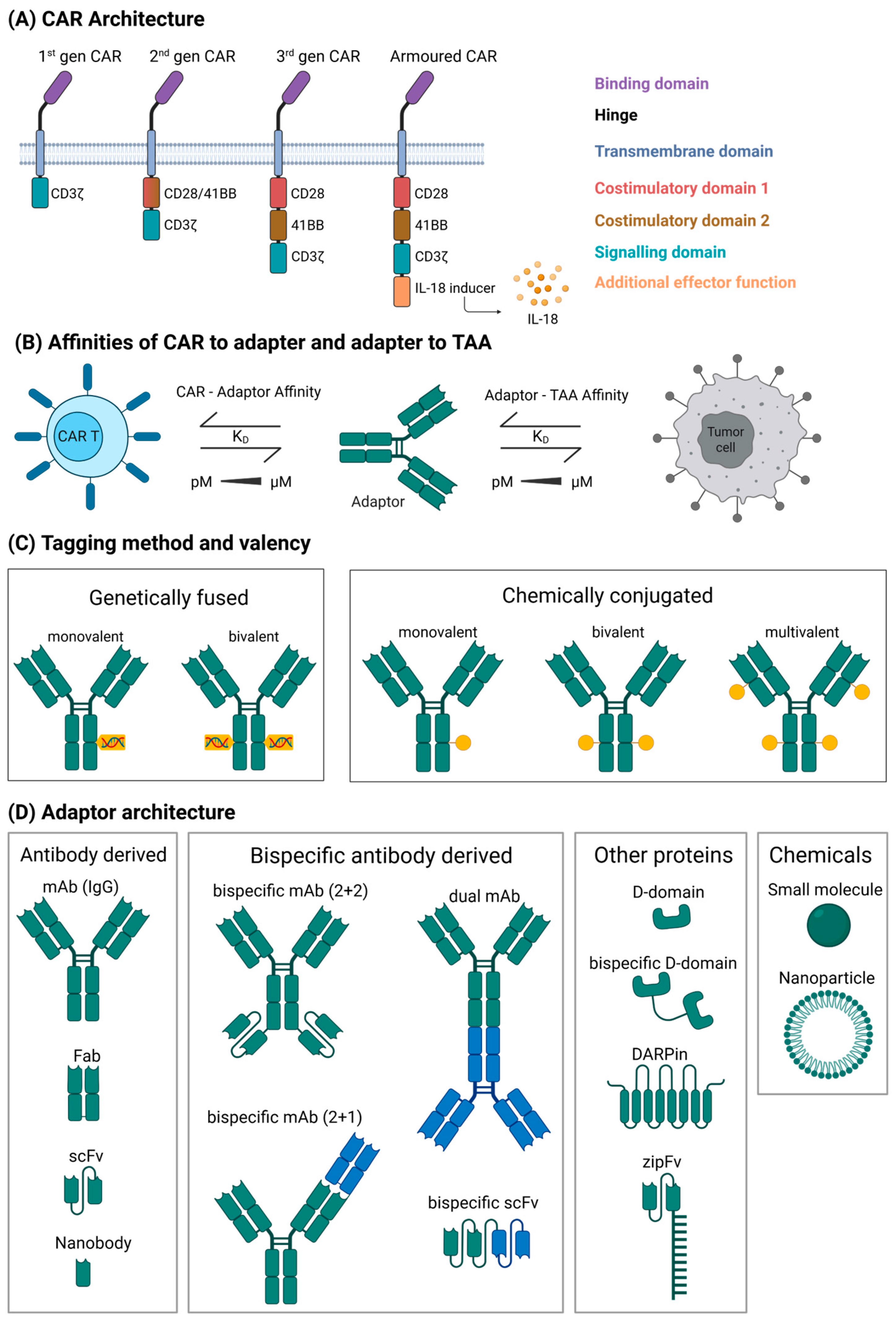- Peptide tags: These tags are usually small peptides genetically fused to the AM and a corresponding antibody-derived binding domain on the CAR. Examples are the UniCAR [15] recognising a peptide derived from the La/SS-B autoantigen or the PNE CAR [16] recognising a yeast transcription factor-derived tag. A variation of this system has a binding domain and protein epitope switched so that the CAR expresses the tag and the AM contains the binding domain.