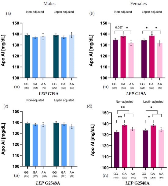Apo-AI levels of LEP G19A genotypes in males (a) and females (b), and LEP G2548A genotypes in males (c) and females (d), non-adjusted and adjusted for leptin levels. * p < 0.05; ** p < 0.01.