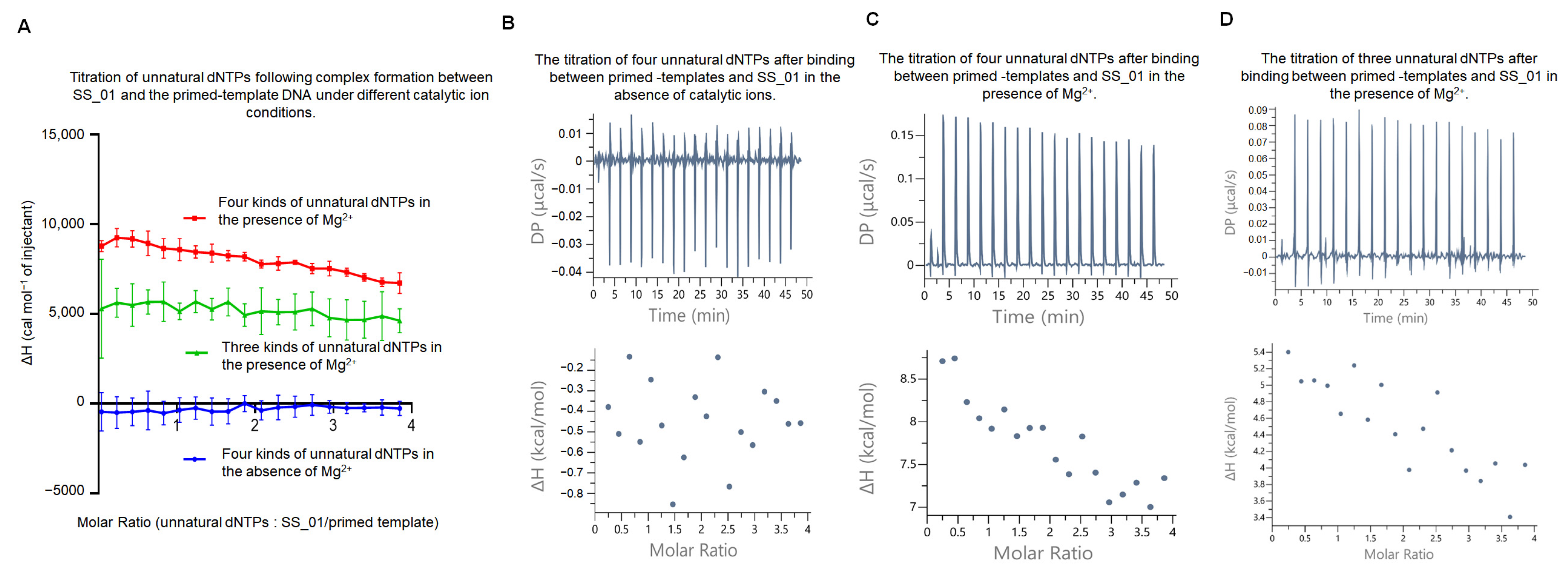 4.9.2. Two-Step ITC Assay for SS_01-Primed-Template Binding Followed by dNTPs or Unnatural Substrate Incorporation