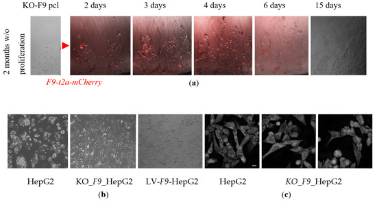 On the sixth day of F9 expression, many cells developed pro-apoptotic blebs, lost adhesion, and acquired a rounded morphology. After approximately two weeks, the remaining cells adhered to the plate proliferated and reached 90% confluence (Figure 3a). Upon reaching 80–90% confluence, the KO-F9-HepG2 polyclonal line was genotyped: the surviving cell pool retained alleles with varying lengths of F9 deletions, but the majority of cells contained the wild type F9 allele, as confirmed by Sanger sequencing. Thus, following the induction of proliferation, the proliferative advantage was observed in cells with the wild type F9 allele in the polyclonal edited KO-F9-HepG2 line. Different growth stages of the cells were distinctly manifested in their varied morphology when plated simultaneously: the parental HepG2 line exhibited greater confluence, with cells interconnected and lacking prominent protrusions, growing upwards rather than spreading across the surface, whereas KO-F9-HepG2 displayed lower confluence, with some cells exhibiting pronounced protrusions characteristic of proliferating cells, while others lost adhesion to the plate surface and assumed a round shape (Figure 3b,c).