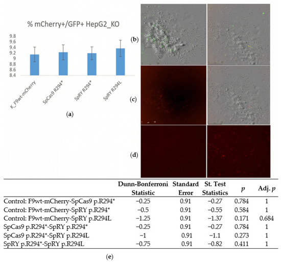 Evaluation of editing frequency of F9(p.R294*)-mCherry during transient expression in HepG2_KO_F9 Cells: (a) A histogram displaying the proportions of GFP+mCherry+ HepG2_KO-F9 cells transfected with prime-editing constructs: SpCas9 p.R294*: pU6-pegRNA-F9(p.R294*)-SpCas9, pSpCas9-GFP, nicking gRNA_F9(p.R294*), LV-F9(p.R294*)-mCherry; SpRY p.R294*: pU6-pegRNA-F9(p.R294*)-SpRY, SpRY-GFP, nicking gRNA_F9(p.R294*), LV-F9(p.R294*)-mCherry; SpRY p.R294L: pU6-pegRNA-F9(p.R294L)-SpRY, SpRY-GFP, nicking gRNA_F9(p.R294*), LV-F9(p.R294*)-mCherry (Incucyte microscopy). The Friedman test indicated that there was no statistically significant difference among the dependent variables, p = 0.552 (Chi2 = 2.1; df = 3). To further confirm the absence of differences in the proportions of GFP+mCherry+ cells between the control and experimental groups, the Dunn–Bonferroni post hoc test was applied. (b) HepG2_KO-F9 cells 48 h post-transfection with editing vectors, showing an overlay of bright-field and GFP fluorescence microscopy, scale bar 500 µm. (c) HepG2_KO-F9 cells 48 h post-transfection with editing vectors, mCherry fluorescence, scale bar 500 µm; (d) Non treated control cells on the left, F9wt-mCherry control cells on the right: mCherry fluorescence, scale bar 500 µm; (e) Table of results from pairwise comparisons using the Dunn-Bonferroni test of mCherry+ cell frequencies upon transfection with lentiviral vectors F9-t2a-mCherry as a control and edited pools of cells with substrate vectors containing nonsense and missense mutations in F9: the absence of differences in mCherry+ frequencies between control cells and edited transient model cells with substrate vectors containing nonsense mutations in F9 indicates a high frequency of restoration of the reading frame of the substrate sequences.
