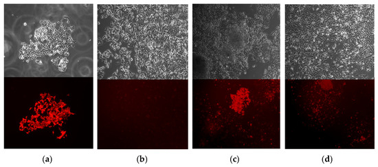 Editing of the stable line F9-p.R379*-mCherry: (a) Control cells KO-F9-HepG2 transduced with LV-F9wt-mCherry: top-phase-contrast microscopy, bottom-fluorescence microscopy in the mCherry detection channel (50× magnification); (b) KO-F9-HepG2 cells transduced with LV-F9-p.R379*-mCherry: top-phase-contrast microscopy, bottom-fluorescence microscopy in the mCherry detection channel (50× magnification); (c,d) Edited cells from the stable line HepG2-F9-p.R379*-mCherry: top-phase-contrast microscopy, bottom-fluorescence microscopy in the mCherry detection channel (50× magnification); mCherry+ cells contain substrate target sequences F9-mCherry with restored reading frame.