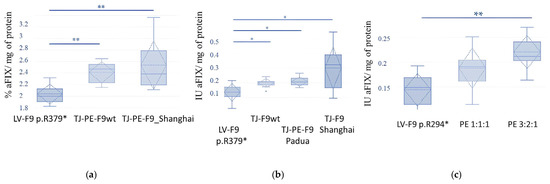 The impact of editing the p.R379* and p.R294* mutations on FIX Activity in stable HepG2 cell Lines: (a) Comparison of FIX activity in the supernatants of edited and control cell lines: standard deviation, confidence interval, medians, and means are indicated; statistical significance of the observed differences was assessed using the Kruskal-Wallis non-parametric test (p = 0.006), and confirmed by the Friedman test (p = 0.002). The Dunn–Bonferroni post-hoc test for pairwise comparisons between the groups LV-F9_p.R379*-LV-F9_p.R379*/TJ-PE-F9wt and LV-F9_p.R379*-LV-F9_p.R379*/TJ-PE-F9_Shanghai showed significant differences in each pair when summarizing data from three biological and three technical replicates (** Adj. p = 0.008), % aFIX (100%–1ME/mL); (b) Comparison of FIX activity in the concentrates of supernatants from edited and control cell lines: standard deviation, confidence interval, medians, and means are indicated; statistical significance of the observed differences in FIX activity between the edited and control cell pools was assessed using the Kruskal–Wallis non-parametric test (p = 0.031), and confirmed by the Friedman test (p = 0.006). The Dunn–Bonferroni post hoc test for pairwise comparisons between the groups LV-F9_p.R379*-LV-F9_p.R379*/TJ-PE-F9wt (*Adj. p= 0.015), LV-F9_p.R379*-LV-F9_p.R379*/TJ-PE-F9_Padua (Adj. * p = 0.047), and LV-F9_p.R379*-LV-F9_p.R379*/TJ-PE-F9_Shanghai (**Adj. p = 0.008) indicated significant differences in each pair when summarizing data from three biological and three technical replicates; (c) Comparison of FIX activity in the concentrates of supernatants from edited mixtures of editing vectors in two vector ratios (SpRY:pegRNA:gRNA, respectively) and control cell lines R294*: statistical significance of the observed differences in FIX activity between the edited and control cell pools was assessed using the Kruskal–Wallis non-parametric test (p = 0.003), and confirmed by the Friedman test (p = 0.002). The Dunn–Bonferroni post hoc test for pairwise comparisons showed significant differences for the groups LV-F9_p.R294* (3:2:1) and LV-F9_p.R294* (** Adj. p = 0.001).