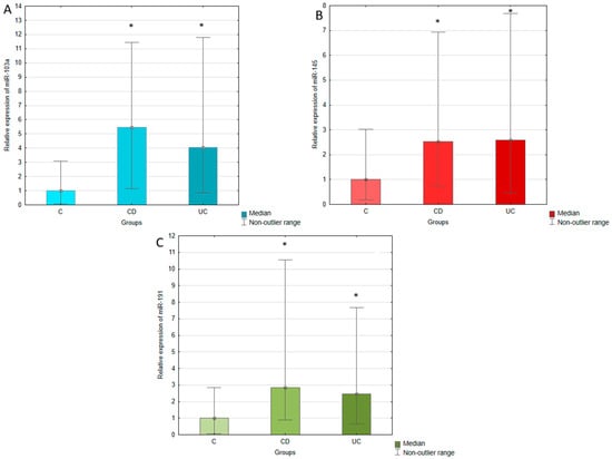 Relative expression of miR-103a (A), miR-145 (B), and miR-191 (C) in ulcerative colitis (UC), Crohn’s disease (CD), and control (C) groups. The results are presented as median fold change in relation to the control group. *, p < 0.05 with regard to the control group.
