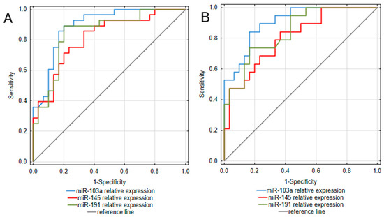 ROC curve analysis of miRNAs utility as diagnostic biomarkers of ulcerative colitis (A) and Crohn’s disease (B).