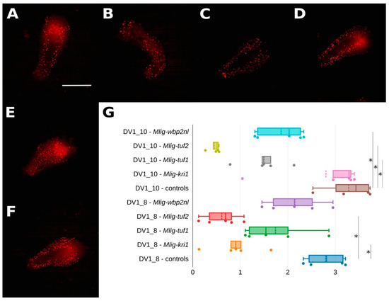 Silencing of the target genes mainly results in reduced cell proliferation. (A–F) EdU-staining showing cell proliferation in Mlig-kri1(RNAi) (A), Mlig-tuf1(RNAi) (B), Mlig-tuf2(RNAi) (C), Mlig-wbp2nl(RNAi) (D), and control (E,F) groups of worms (DV1_8 and DV1_10 controls). EdU labeled cells are in red. Scale bar 300 µm. (G) Quantification of EdU-specific fluorescence in RNAi-treated worms. * marked significant difference (p < 0.05).