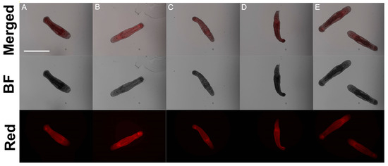 However, phalloidin-staining showed no difference in both patterns and fluorescence intensity in the control and experimental groups of worms (Figure 2 and Figure S2). In each examined specimen, all the main structures are presented: the muscle bag all over the worm with two regions with additional muscle density—the pharynx, which requires more muscles for swallowing, and part of the posterior (tail) region containing seminal vesicles, stylet, and attendant muscles.