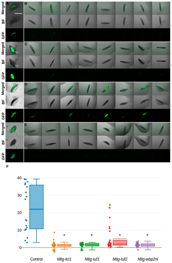 RNAi-mediated loss-of-fluorescence patterns in the M. lignano specimens from the transgenic line APOB::GFP (A–E). Scale bar 1 mm. (A) control; (B) Mlig-kri1(RNAi); (C) Mlig-tuf1(RNAi); (D) Mlig-tuf2(RNAi); (E) Mlig-wbp2nl(RNAi); (F) quantification of GFP-specific fluorescence in the RNAi-treated worms. Fluorescence of GFP signals in all target genes decreased to almost zero level. Values below zero resulted from unspecific fluorescence in empty regions taken as background signals. * marked significant difference (p < 0.05) compared to control group.