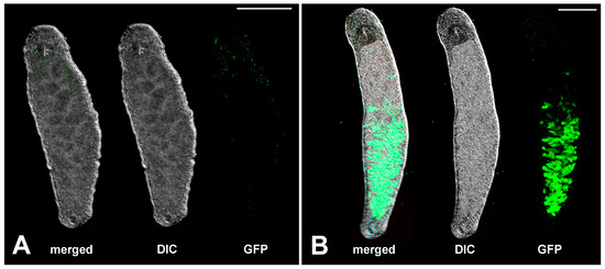 Microimages of alive specimens of M. lignano from the wild-type NL12 line (A) and the transgenic line APOB::GFP (B). DIC—differential interference contrast image of alive worm. GFP-positive signals (green color) in the intestine represent branched gut. Scale bar 200 µm.