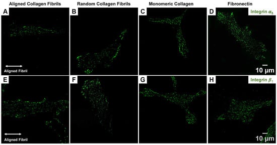The extracellular matrix (ECM) contains a wealth of biochemical, mechanical, and topographical cues, and cellular interaction with the ECM plays a key role in a number of physiological and pathophysiological processes such as cell proliferation, differentiation, migration, fibrosis, and apoptosis. A key regulator of cell–ECM interactions is the integrins, which are transmembrane receptors that mediate cell interactions with ECM glycoproteins (e.g., collagen, fibronectin) and mechanically link the ECM to the cell’s actin cytoskeleton [1]. Initial binding of an integrin receptor to an ECM protein can be relatively weak. However, the initial binding frequently leads to the recruitment and lateral clustering of additional integrins and can eventually lead to the formation of more stable focal adhesions (FAs) and the assembly of actin stress fibers [2]. Integrin-mediated focal adhesions play an important role in cellular mechanosensing, induce several intracellular processes, and are sensitive to the ECM composition and architecture [3,4].