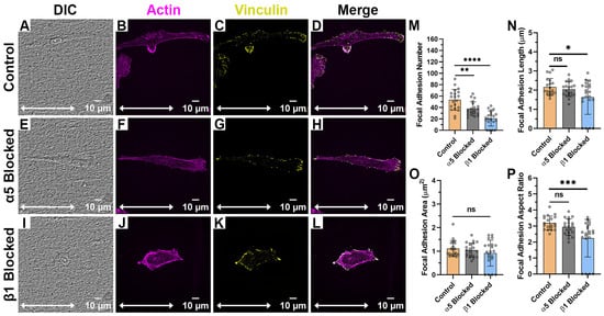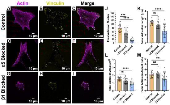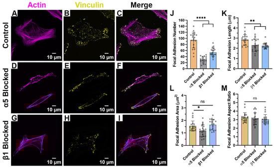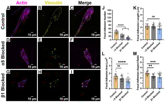 When HTKs were cultured on fibronectin (Figure 7A–I) in the absence of blocking antibodies, we observed cells with a polygonal morphology (Figure 7C) and an increased number of focal adhesions (Table 4) when compared to the other substrates. Blocking the α5 subunit significantly reduced the number of FA by 69% (Figure 7J), the FA length by 18% (Figure 7K), and the FA area by 25% (Figure 7L). Treatment of HTK cells with the β1 blocking antibody significantly reduced the FA number by 43% (Figure 7J) and the FA length by 18% (Figure 6K) but did not significantly change the FA area or FA aspect ratio.